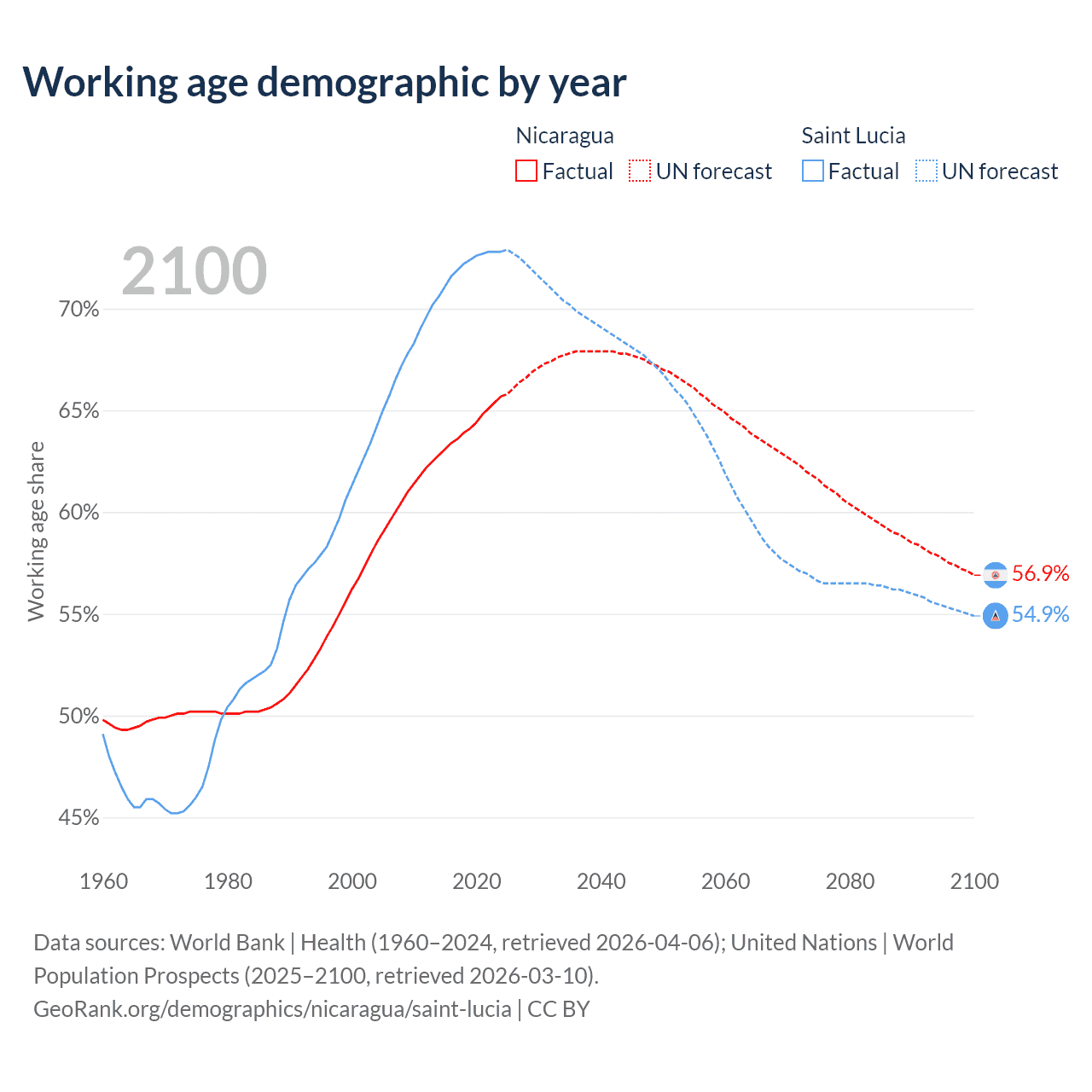 - Nicaragua has 4.68M working age adults (aged 15-64) vs 132K in Saint Lucia.