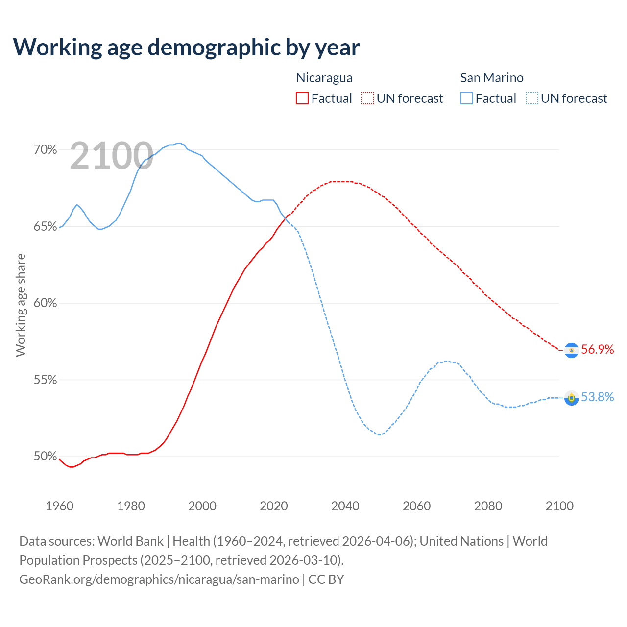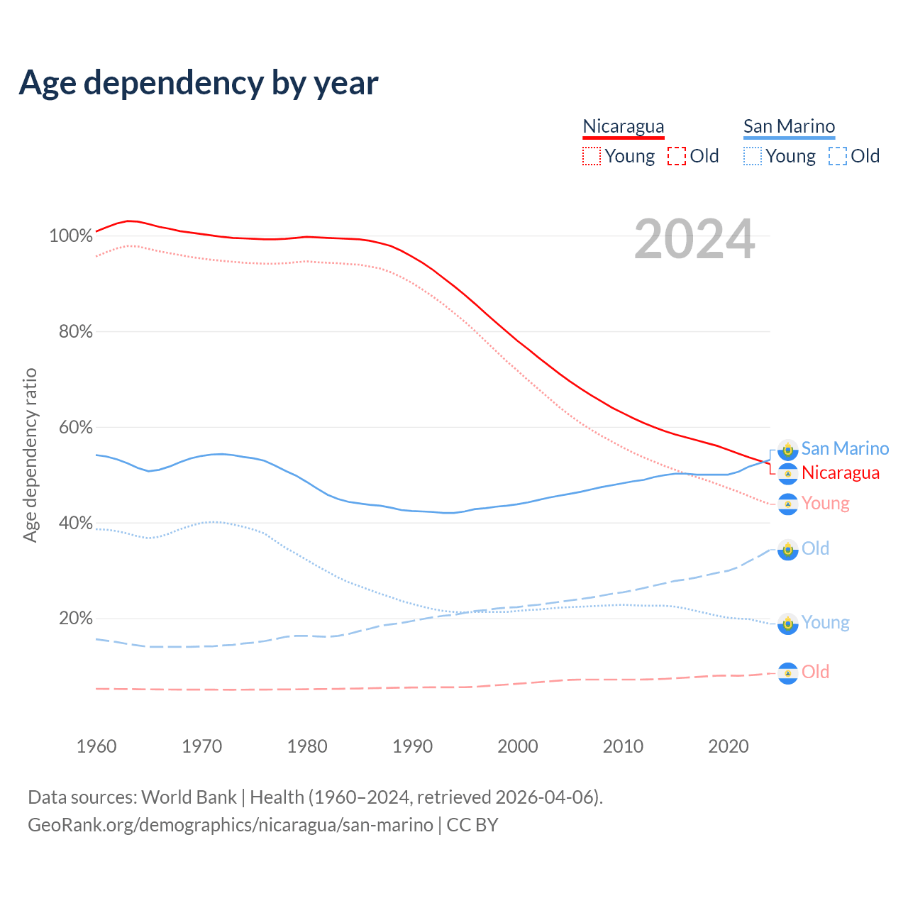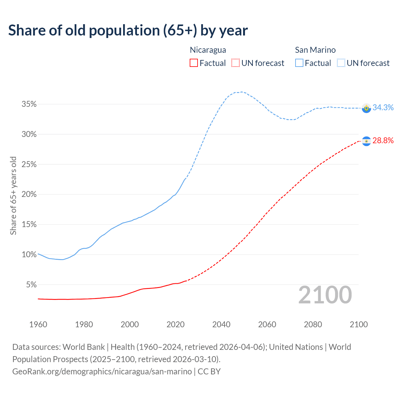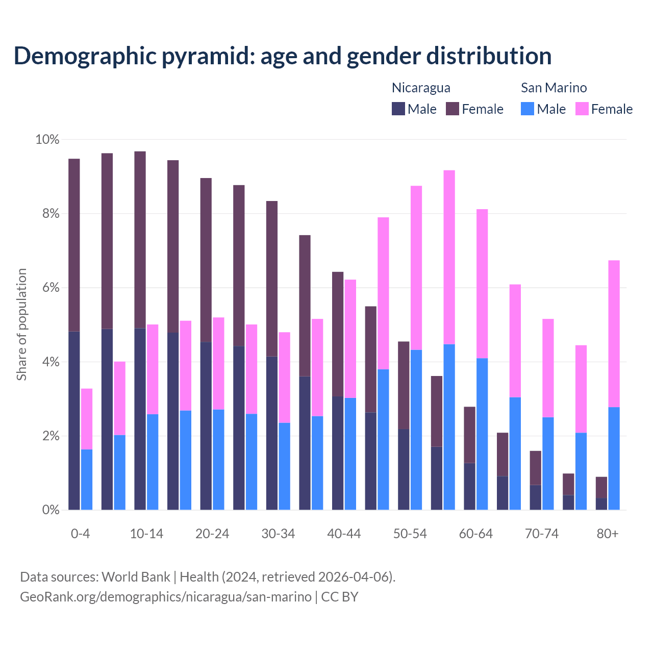 - The share of old-age demographic (65+) in Nicaragua is 5.53% vs 22.4% in San Marino.