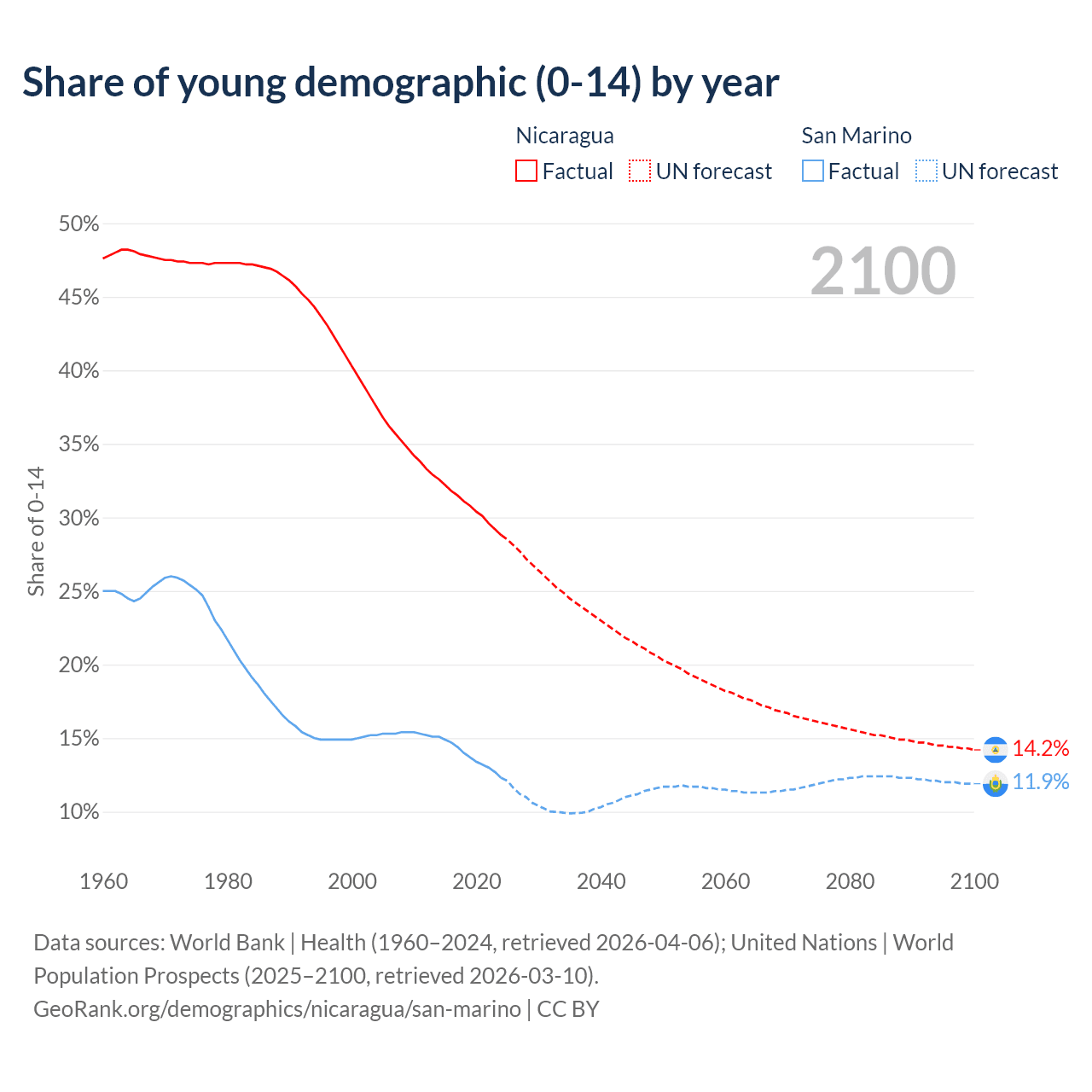 - The share of young demographic (0-15 years old) in Nicaragua is 28.8% vs 12.3% in San Marino.