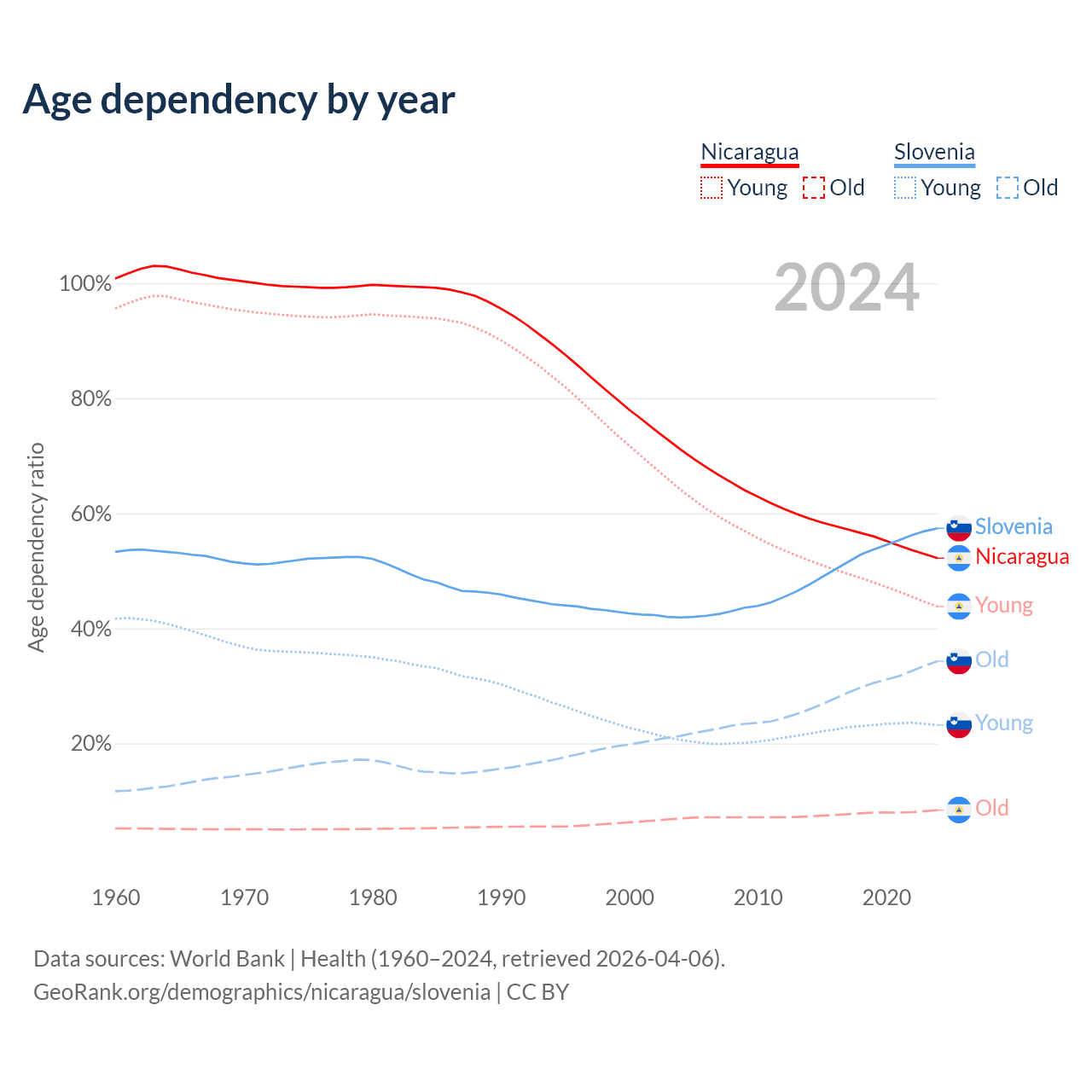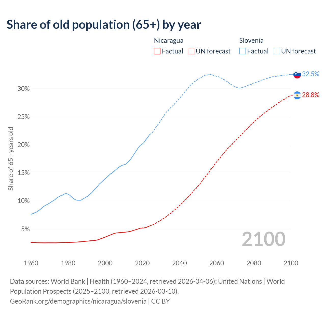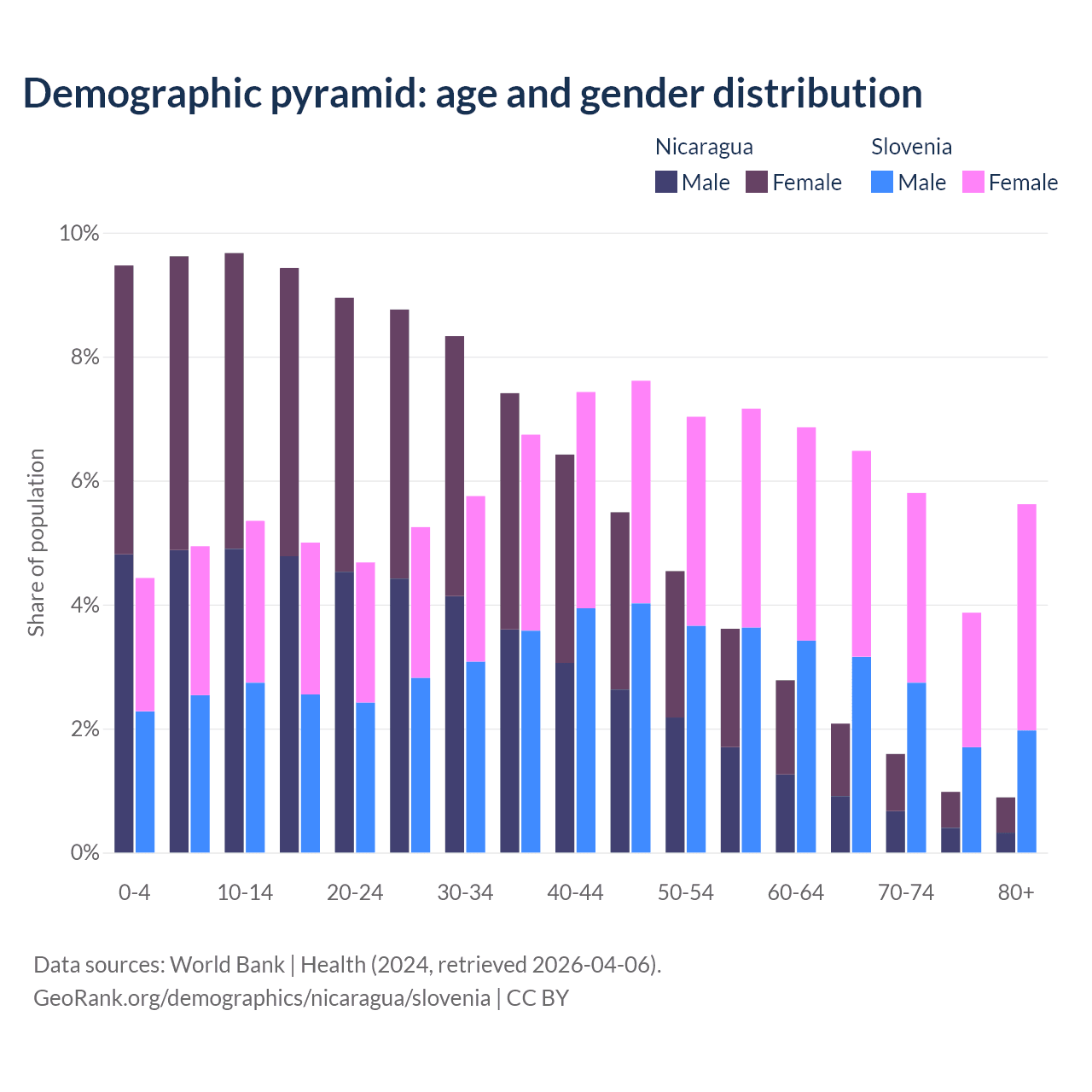 - The share of old-age demographic (65+) in Nicaragua is 5.53% vs 21.8% in Slovenia.