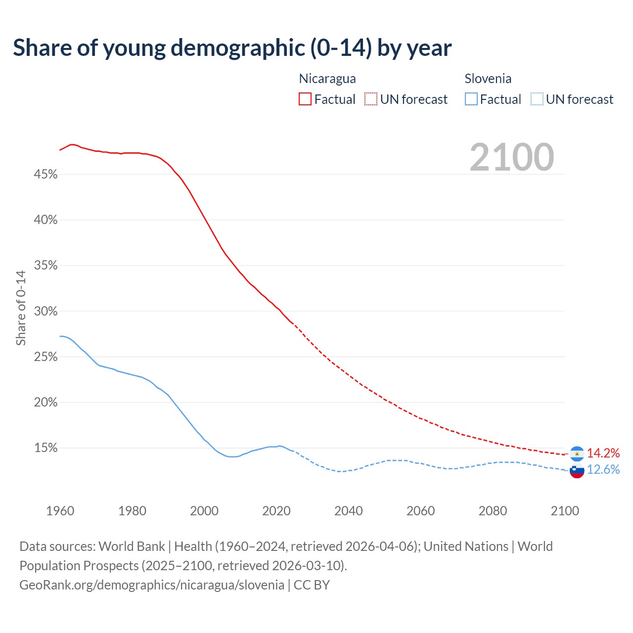 - The share of young demographic (0-15 years old) in Nicaragua is 28.8% vs 14.7% in Slovenia.
