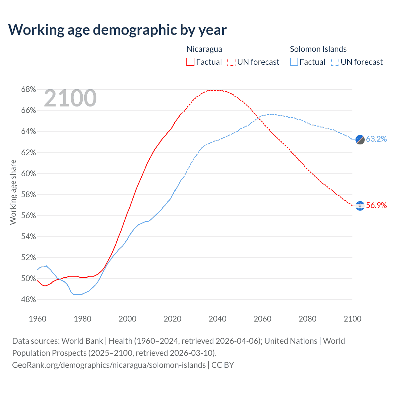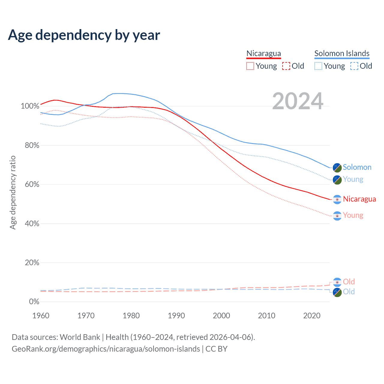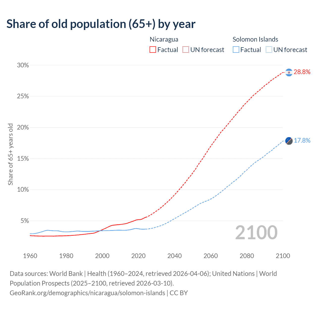 - The share of old-age demographic (65+) in Nicaragua is 5.53% vs 3.64% in the Solomon Islands.