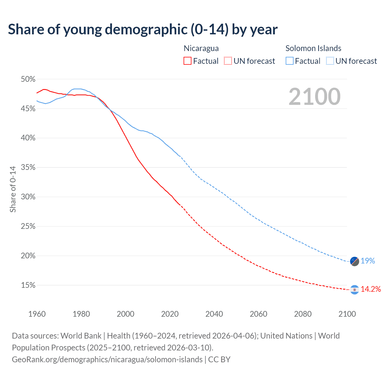 - The share of young demographic (0-15 years old) in Nicaragua is 28.8% vs 37% in the Solomon Islands.