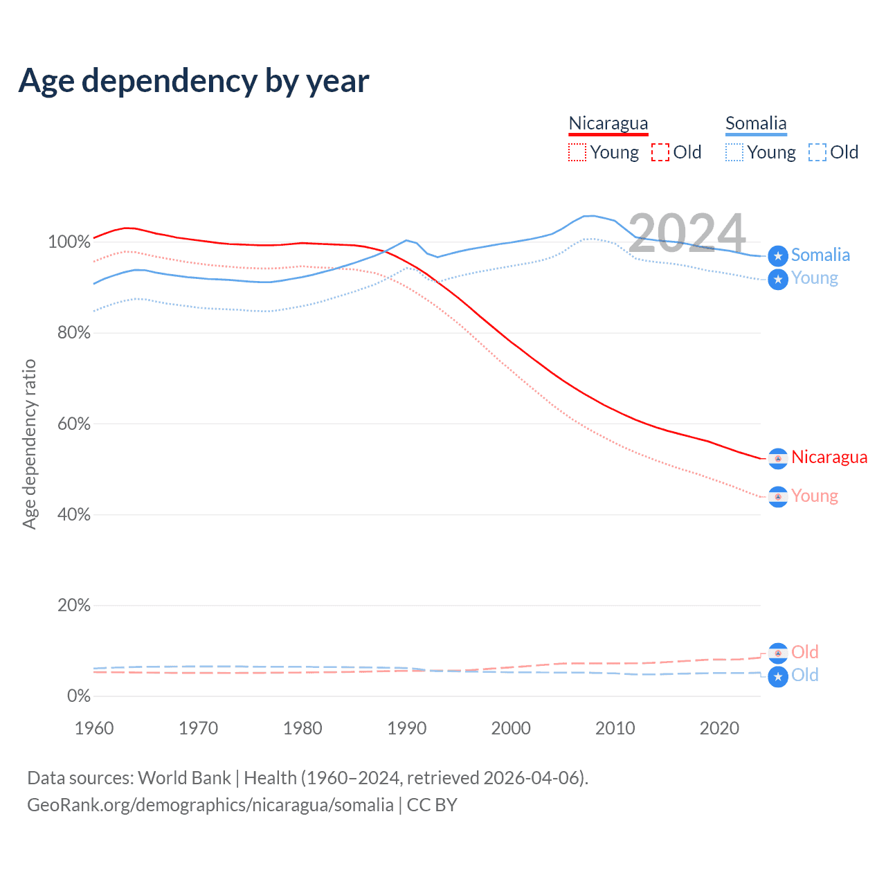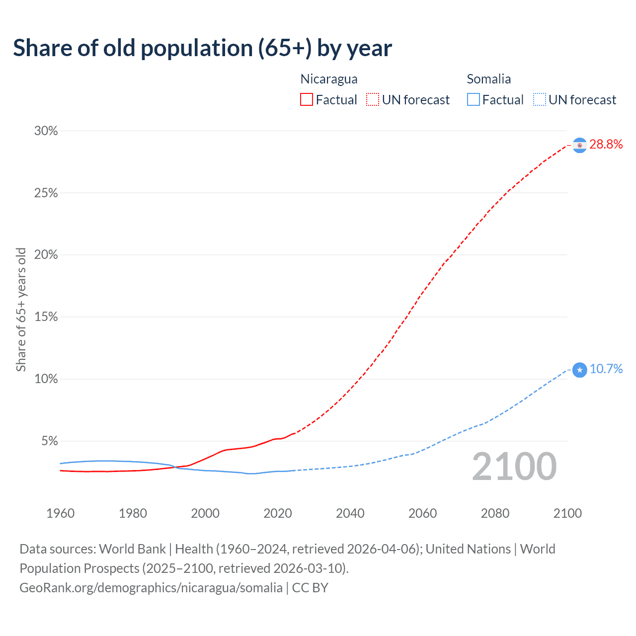 - The share of old-age demographic (65+) in Nicaragua is 5.53% vs 2.59% in Somalia.