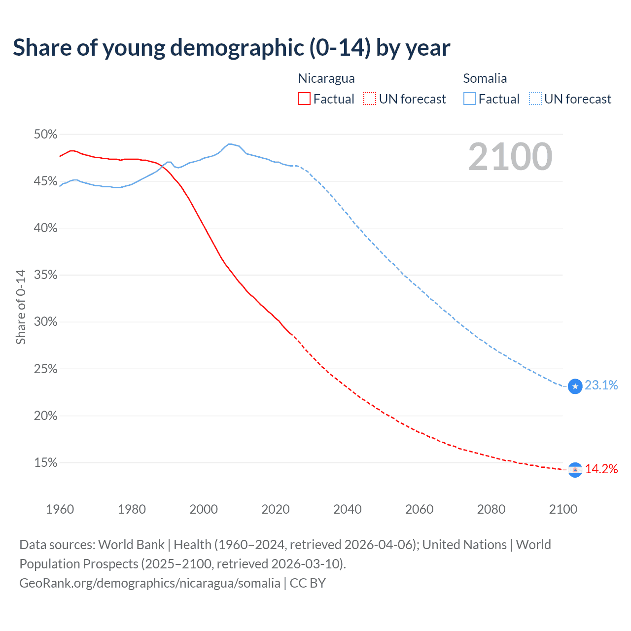 - The share of young demographic (0-15 years old) in Nicaragua is 28.8% vs 46.6% in Somalia.