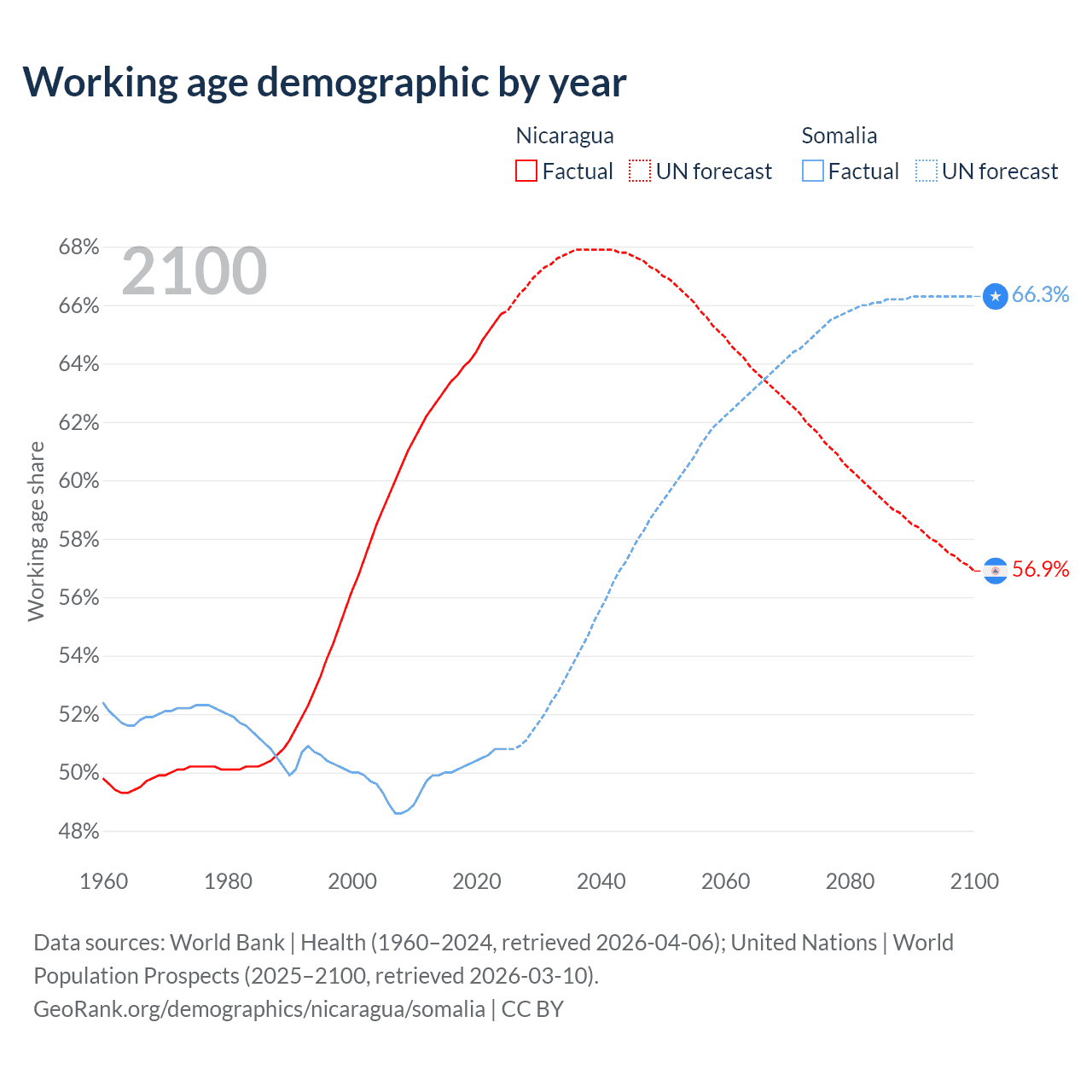 - Nicaragua has 4.68M working age adults (aged 15-64) vs 10.4M in Somalia.
