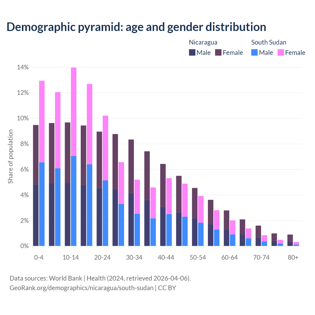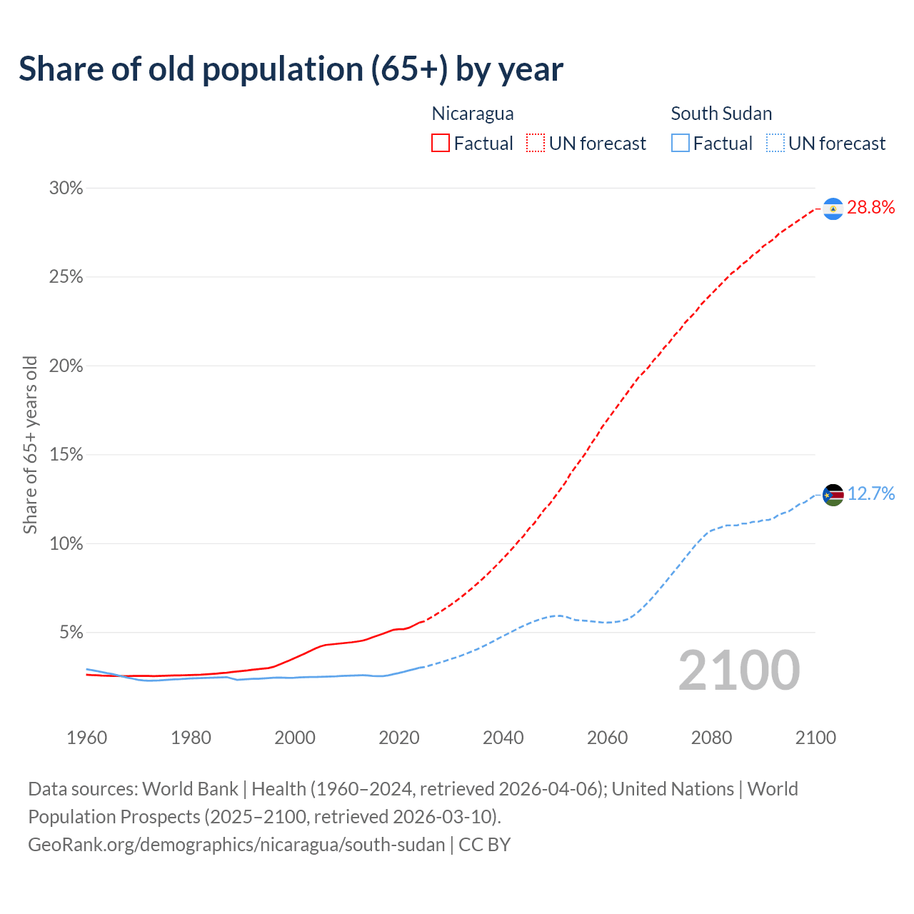 - The share of old-age demographic (65+) in Nicaragua is 5.53% vs 2.99% in South Sudan.