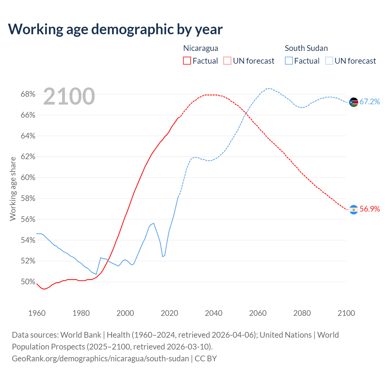 Median age Nicaragua vs South Sudan, 1960-2100