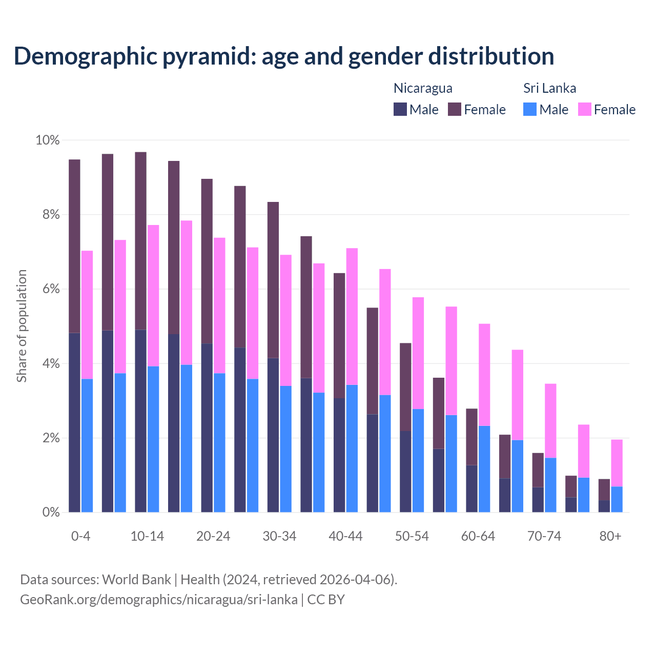 - The median age in Nicaragua is 26.6 years compared to 34.1 years in Sri Lanka.