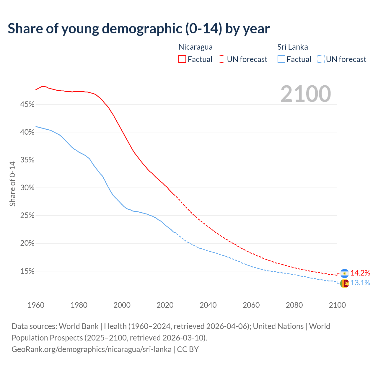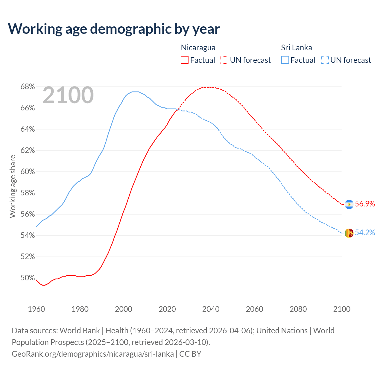 Median age Nicaragua vs Sri Lanka, 1960-2100