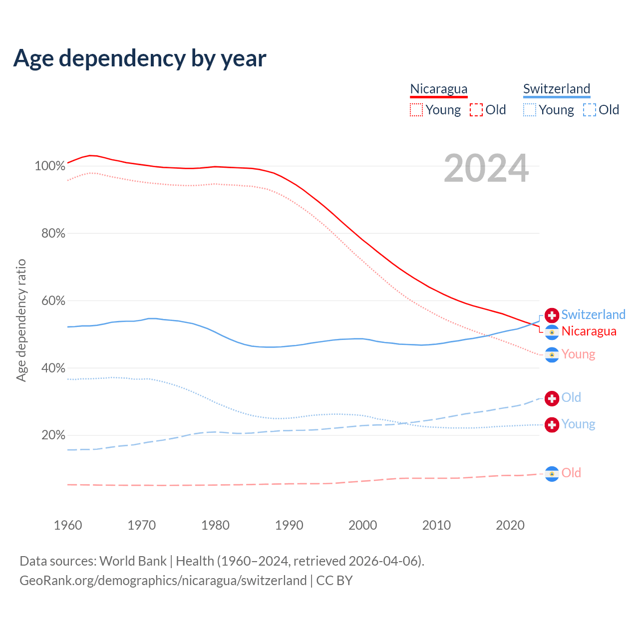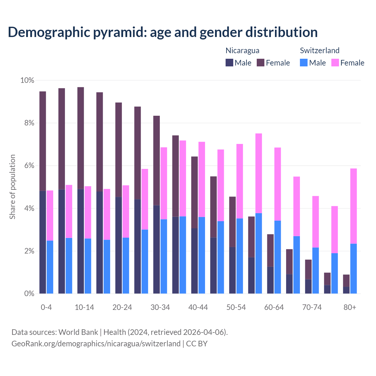 - The share of old-age demographic (65+) in Nicaragua is 5.53% vs 20% in Switzerland.
