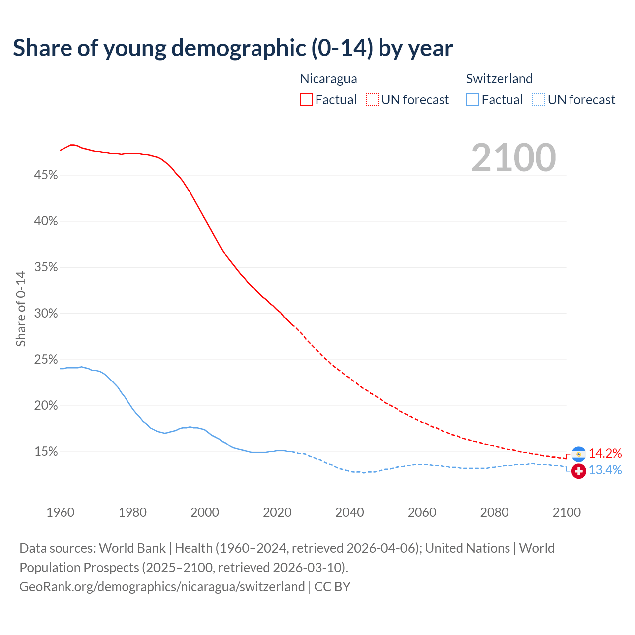 - The share of young demographic (0-15 years old) in Nicaragua is 28.8% vs 15% in Switzerland.