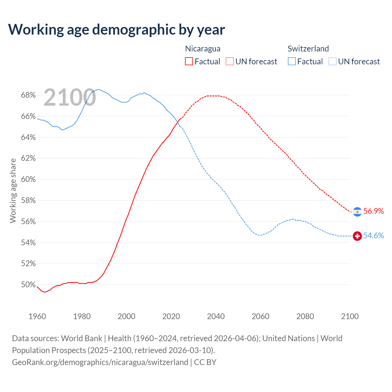 Median age Nicaragua vs Switzerland, 1960-2100
