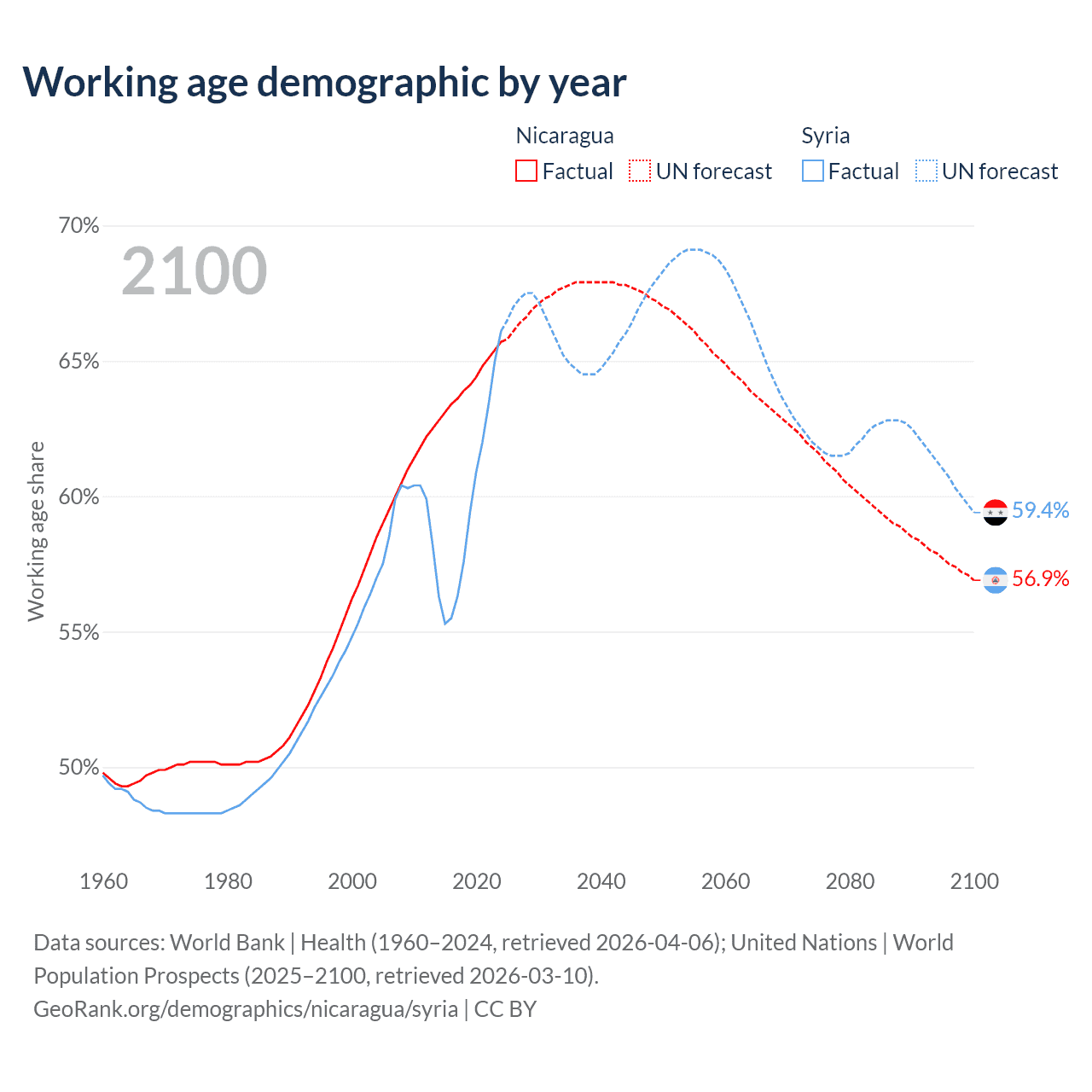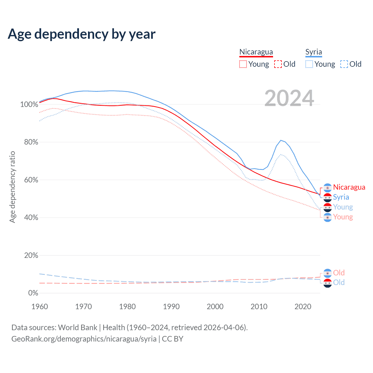 - The share of old-age demographic (65+) in Nicaragua is 5.53% vs 4.74% in Syria.
