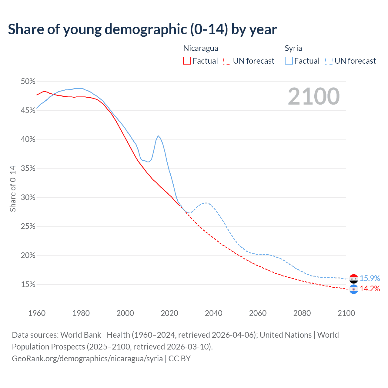 - The share of young demographic (0-15 years old) in Nicaragua is 28.8% vs 29.2% in Syria.