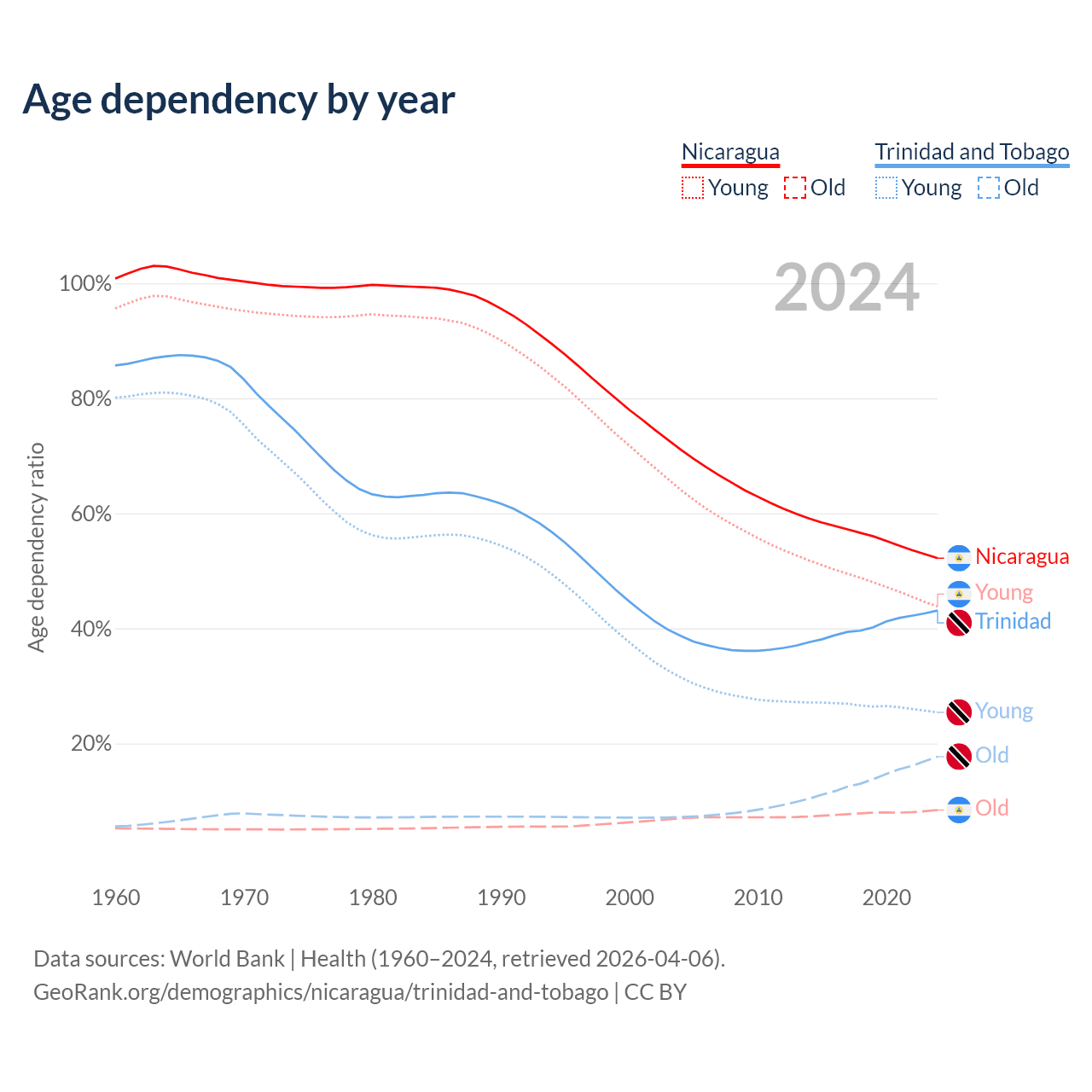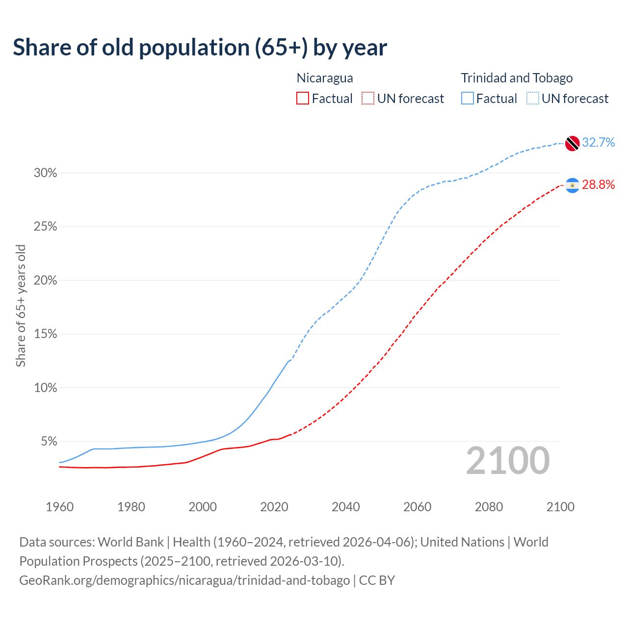 - The share of old-age demographic (65+) in Nicaragua is 5.53% vs 12.4% in Trinidad and Tobago.