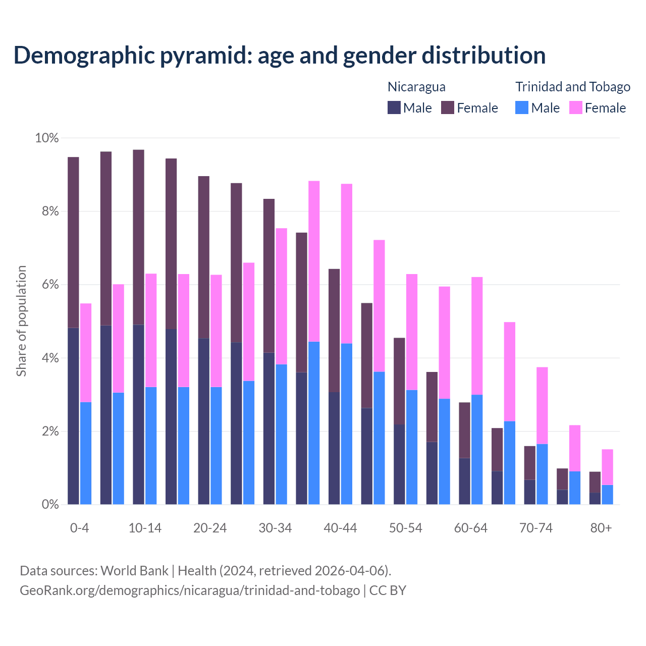 - Nicaragua is ranked 125/196 by median age (oldest to youngest) vs 58/196 for Trinidad and Tobago.