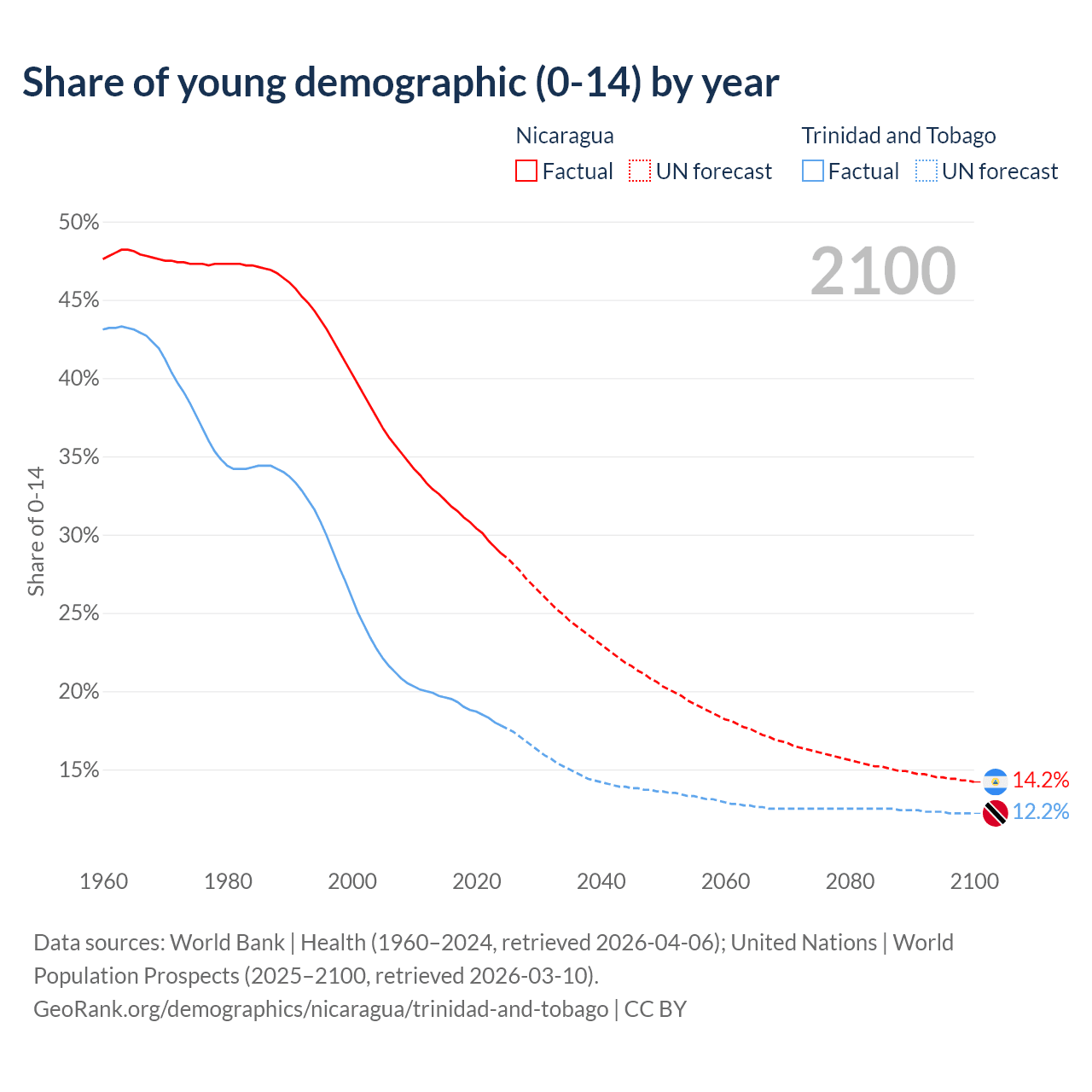 - The share of young demographic (0-15 years old) in Nicaragua is 28.8% vs 17.8% in Trinidad and Tobago.