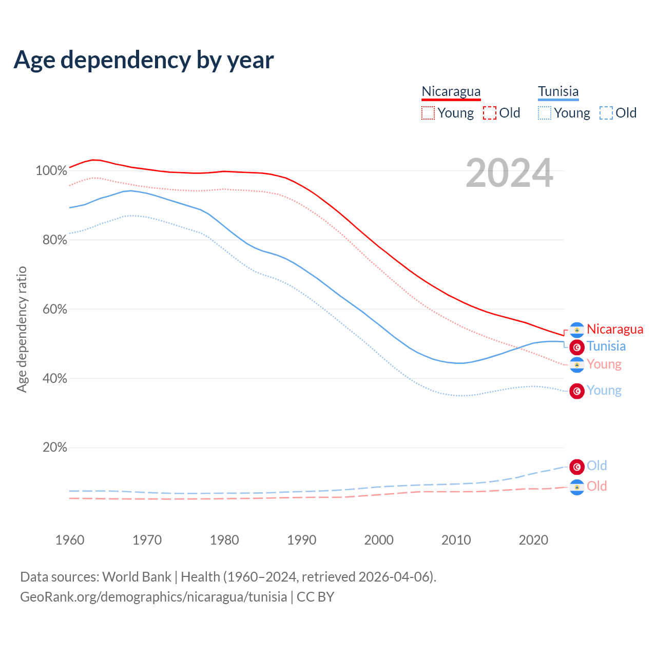 - The share of old-age demographic (65+) in Nicaragua is 5.53% vs 9.53% in Tunisia.