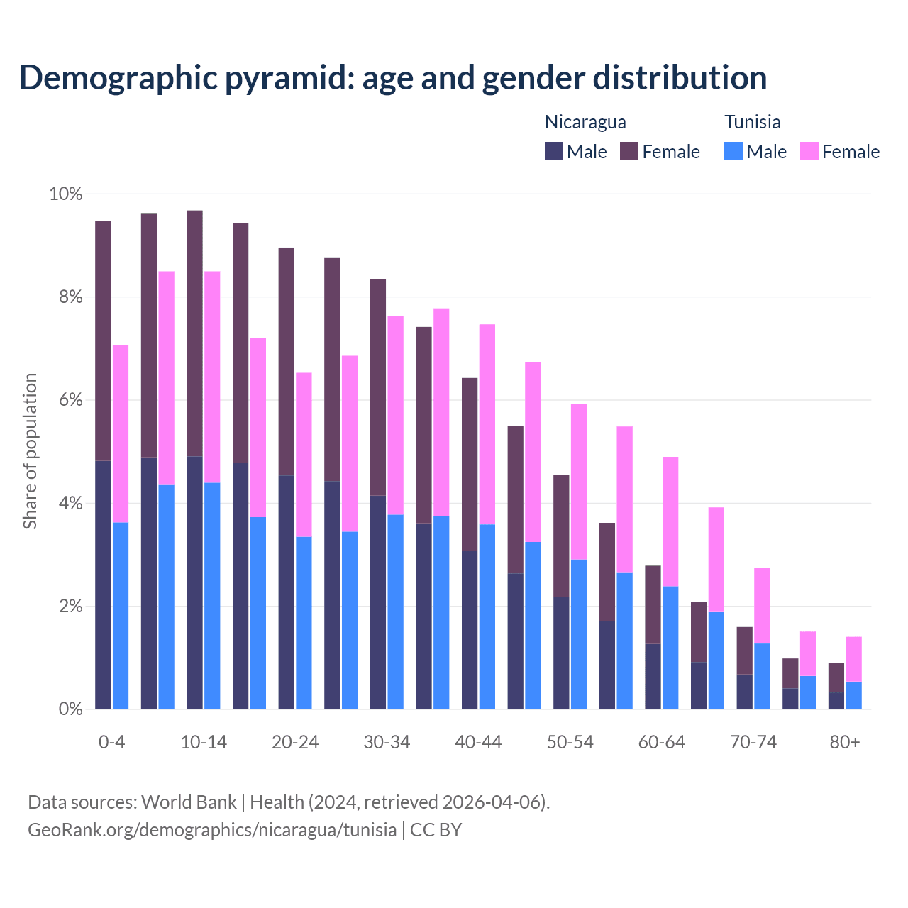 - Nicaragua is ranked 125/196 by median age (oldest to youngest) vs 86/196 for Tunisia.