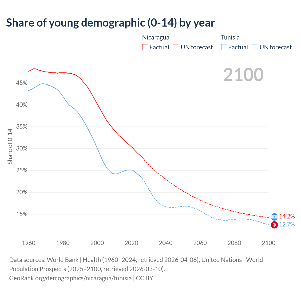 - The share of young demographic (0-15 years old) in Nicaragua is 28.8% vs 24% in Tunisia.