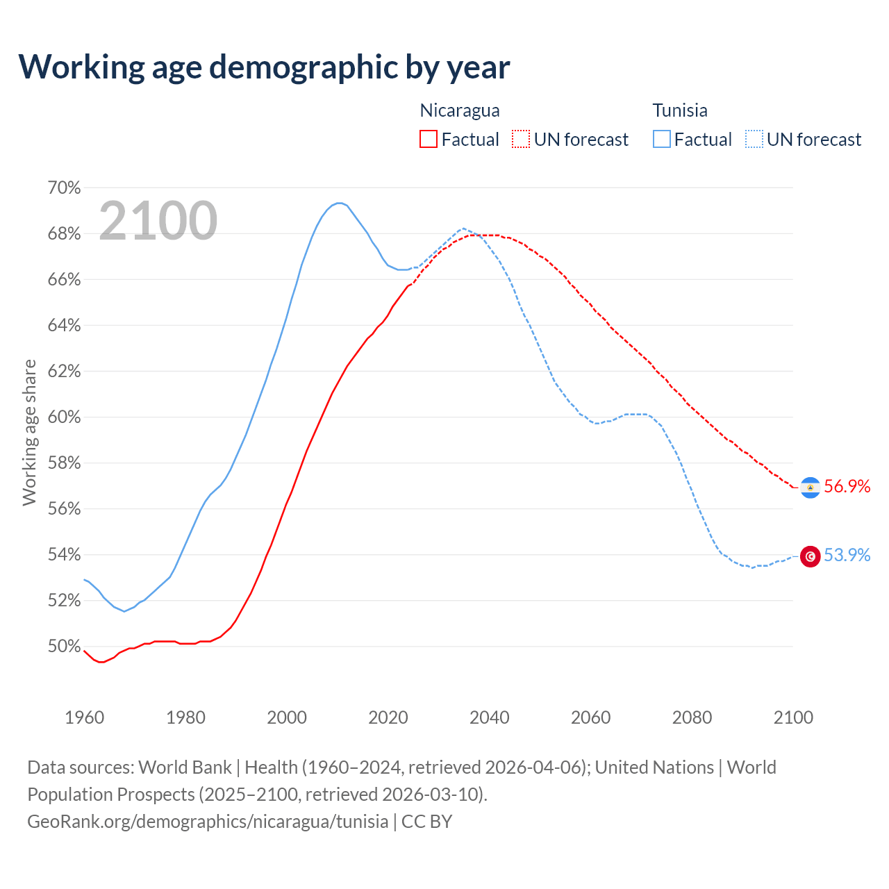 - Nicaragua has 4.68M working age adults (aged 15-64) vs 8.26M in Tunisia.