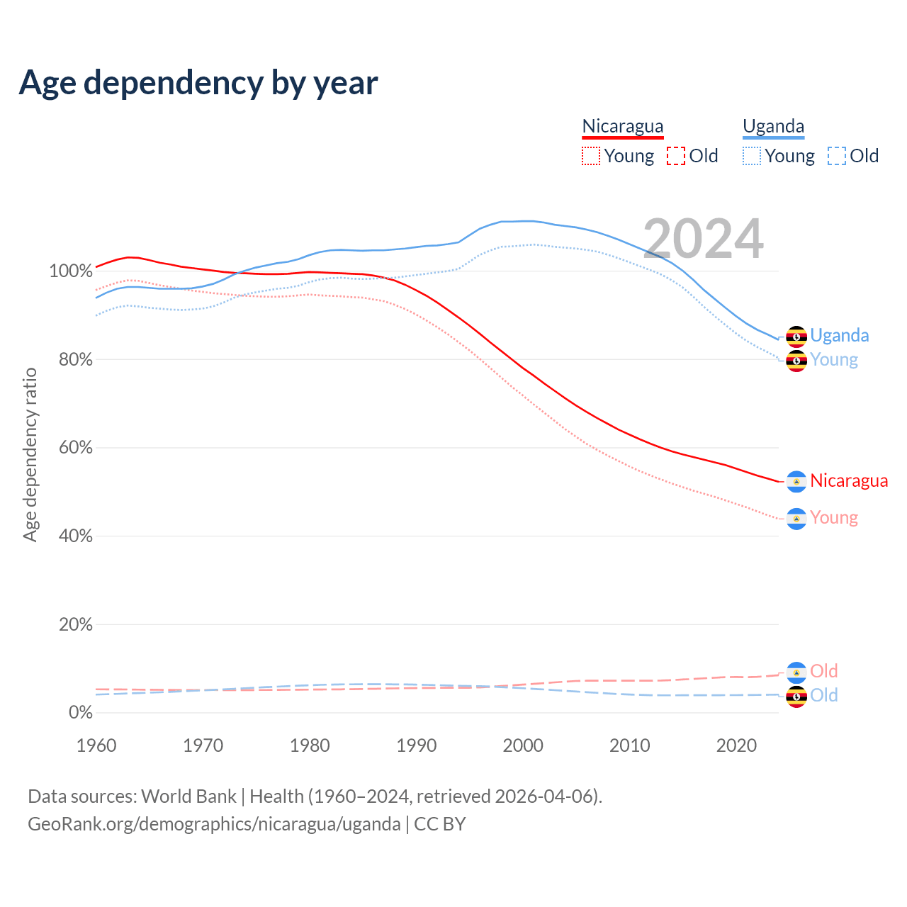 Data sources: World Bank | Health (1960–2024, retrieved 2026-04-06); U.S. Census Bureau (1960–2024, retrieved 2026-02-08).