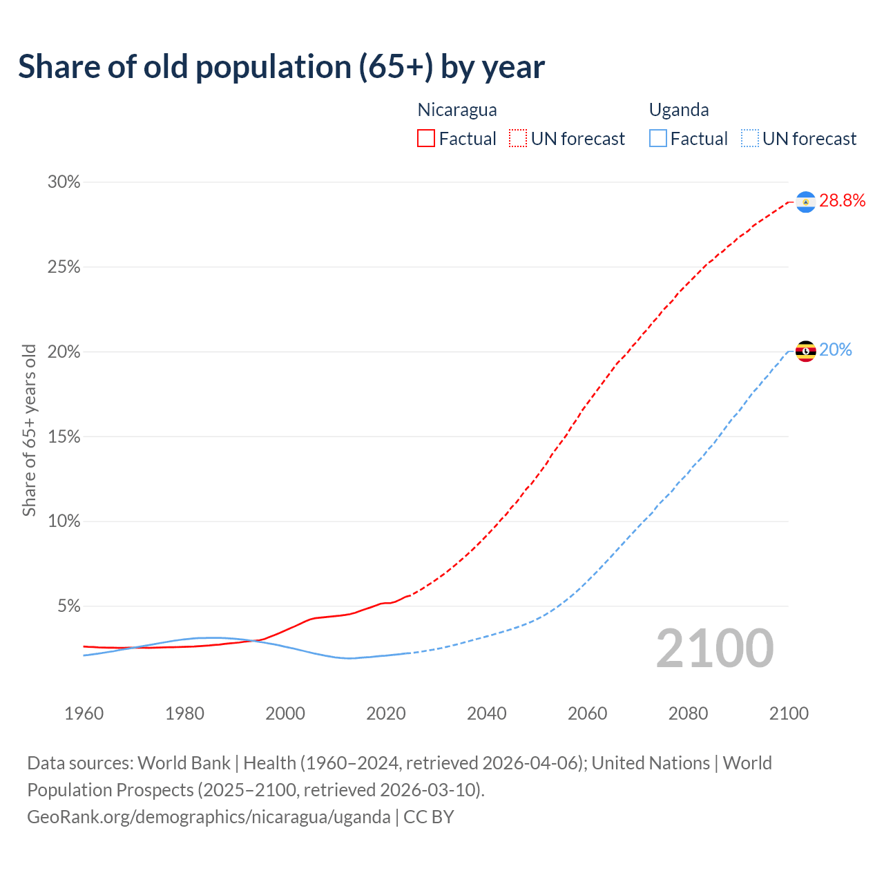 The share of older people aged 65 and over is 5.53% in Nicaragua and 2.19% in Uganda. Life expectancy in Nicaragua compared to Uganda .