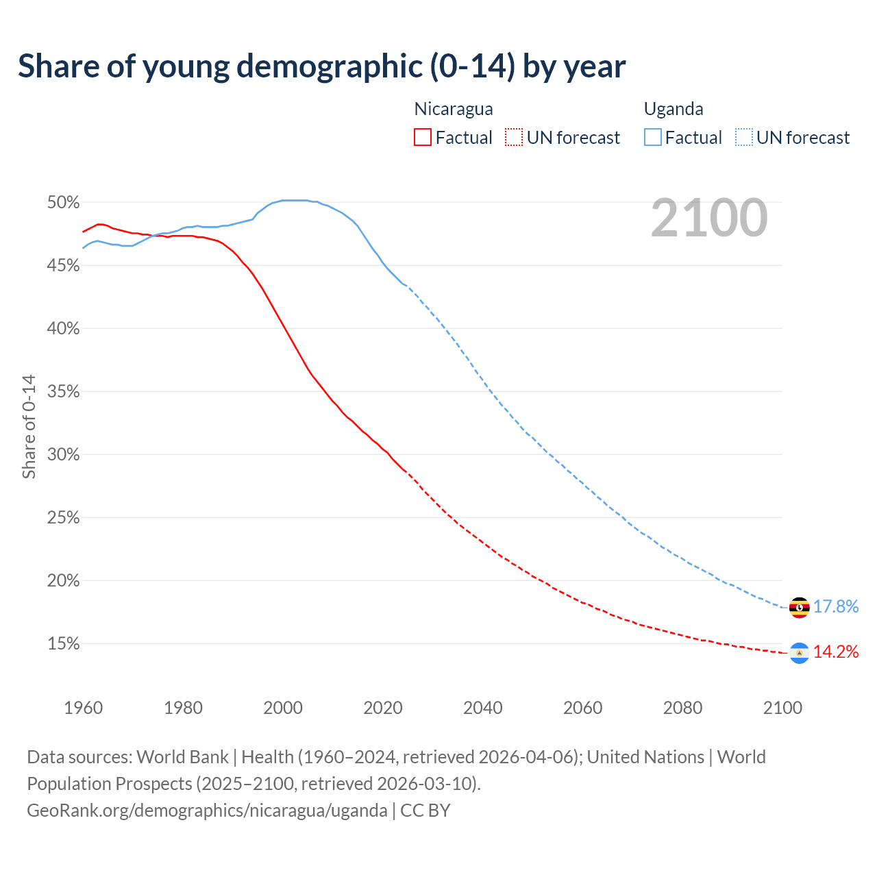Median age Nicaragua vs Uganda, 1960-2100