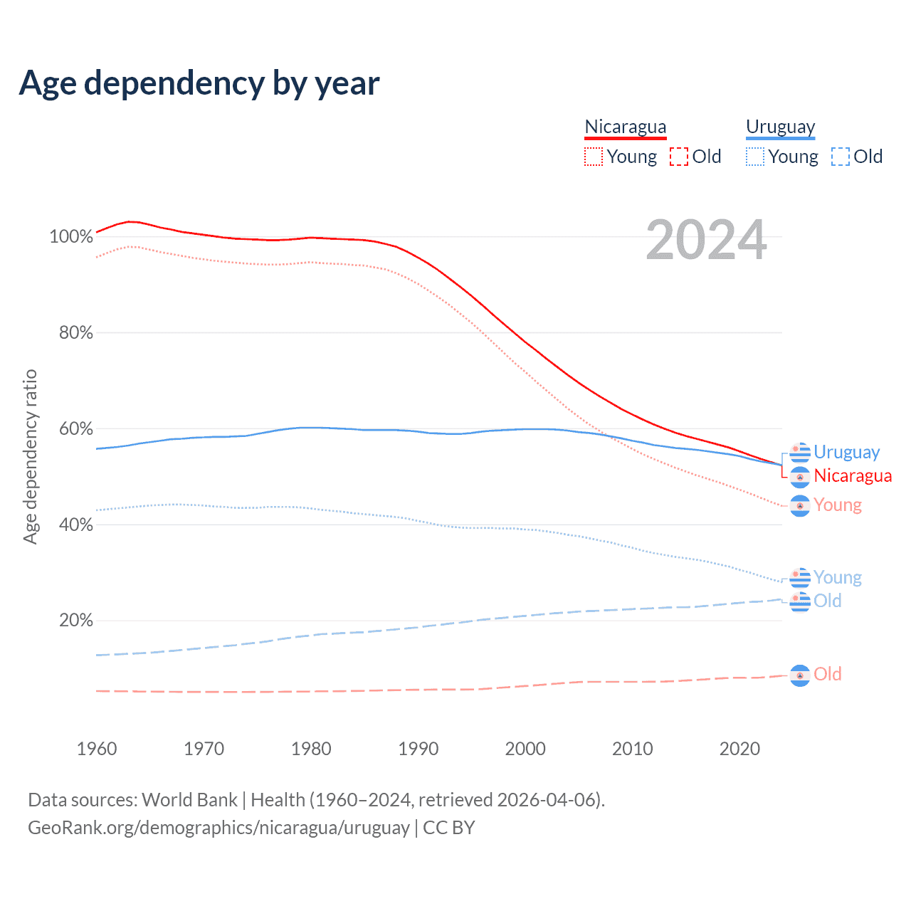 Data sources: World Bank | Health (1960–2024, retrieved 2026-04-06); U.S. Census Bureau (1960–2024, retrieved 2026-02-08).
