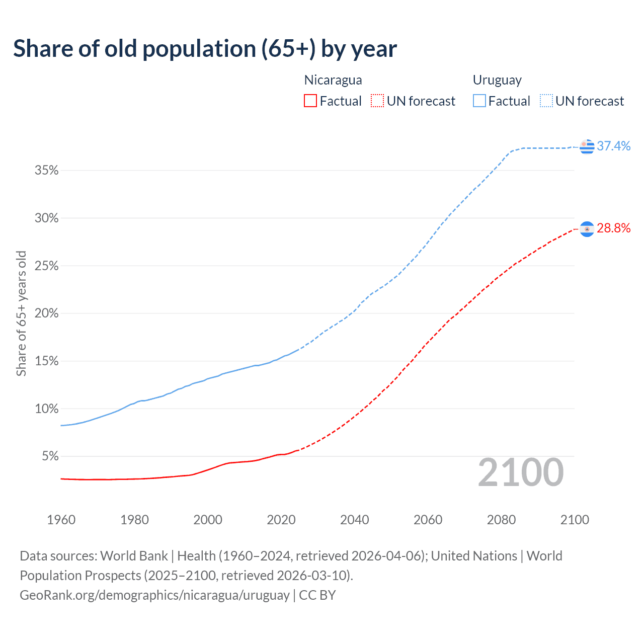 The share of older people aged 65 and over is 5.53% in Nicaragua and 16% in Uruguay. Life expectancy in Nicaragua compared to Uruguay .