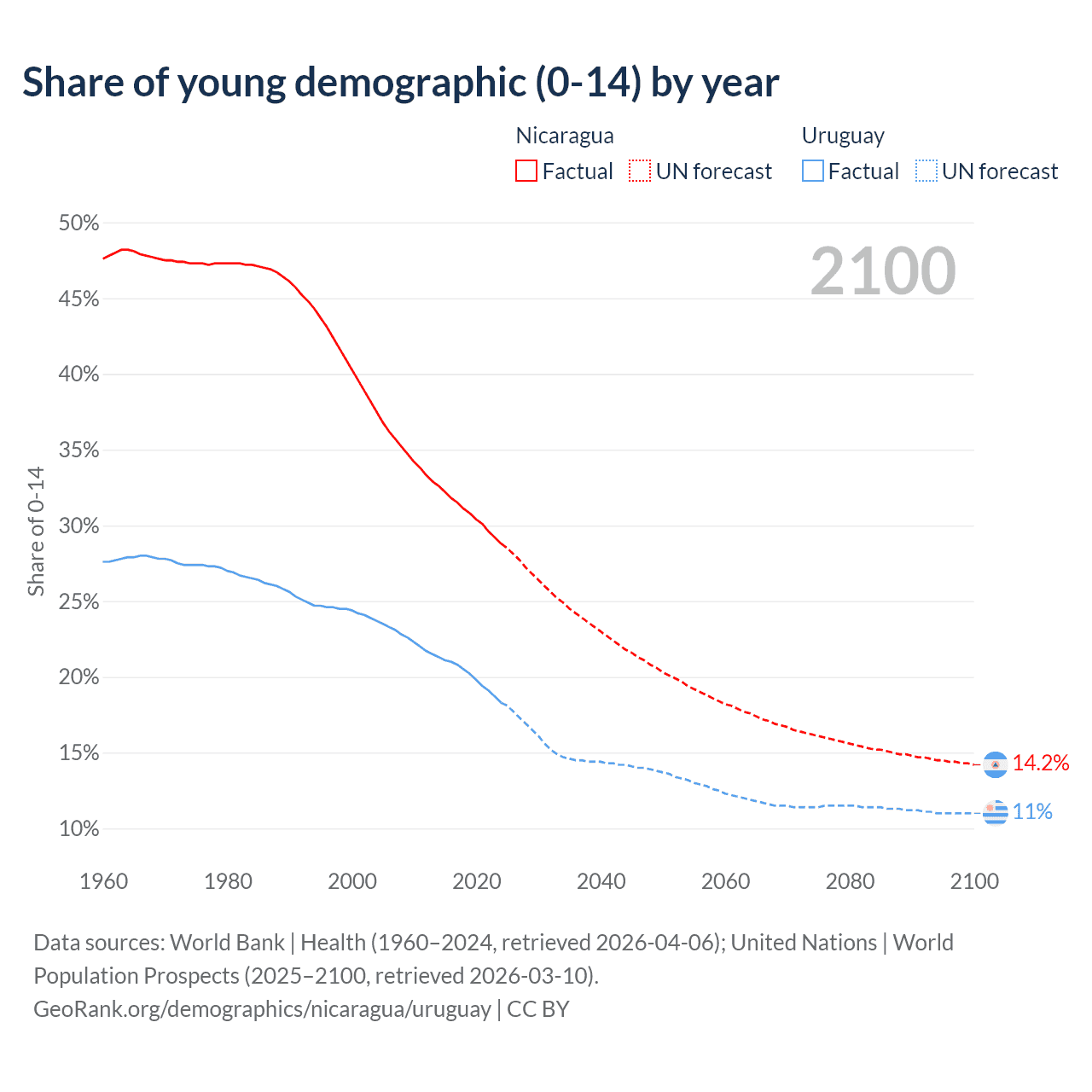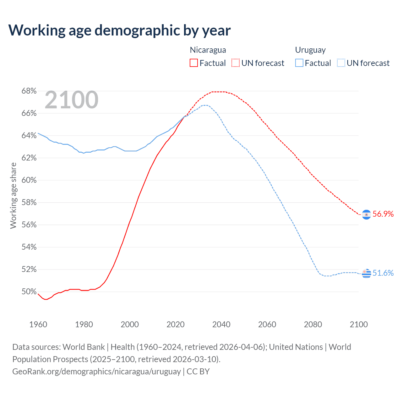 Median age Nicaragua vs Uruguay, 1960-2100