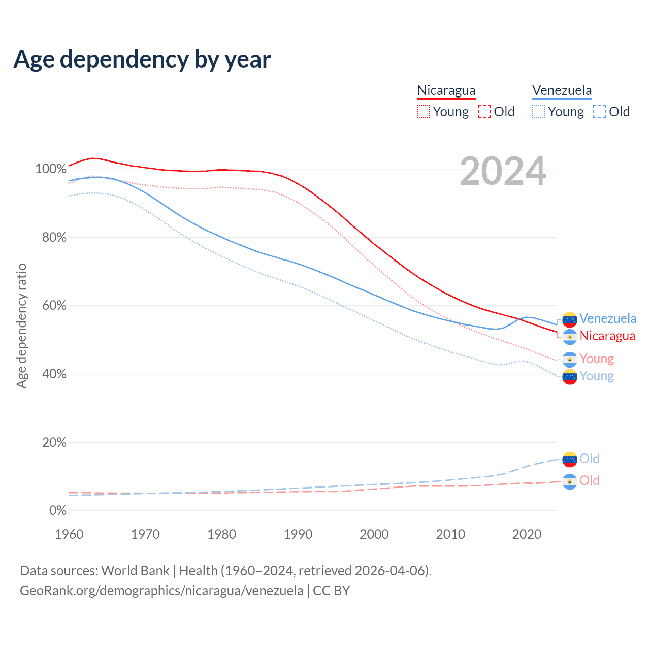 - Nicaragua is ranked 125/196 by median age (oldest to youngest) vs 104/196 for Venezuela.