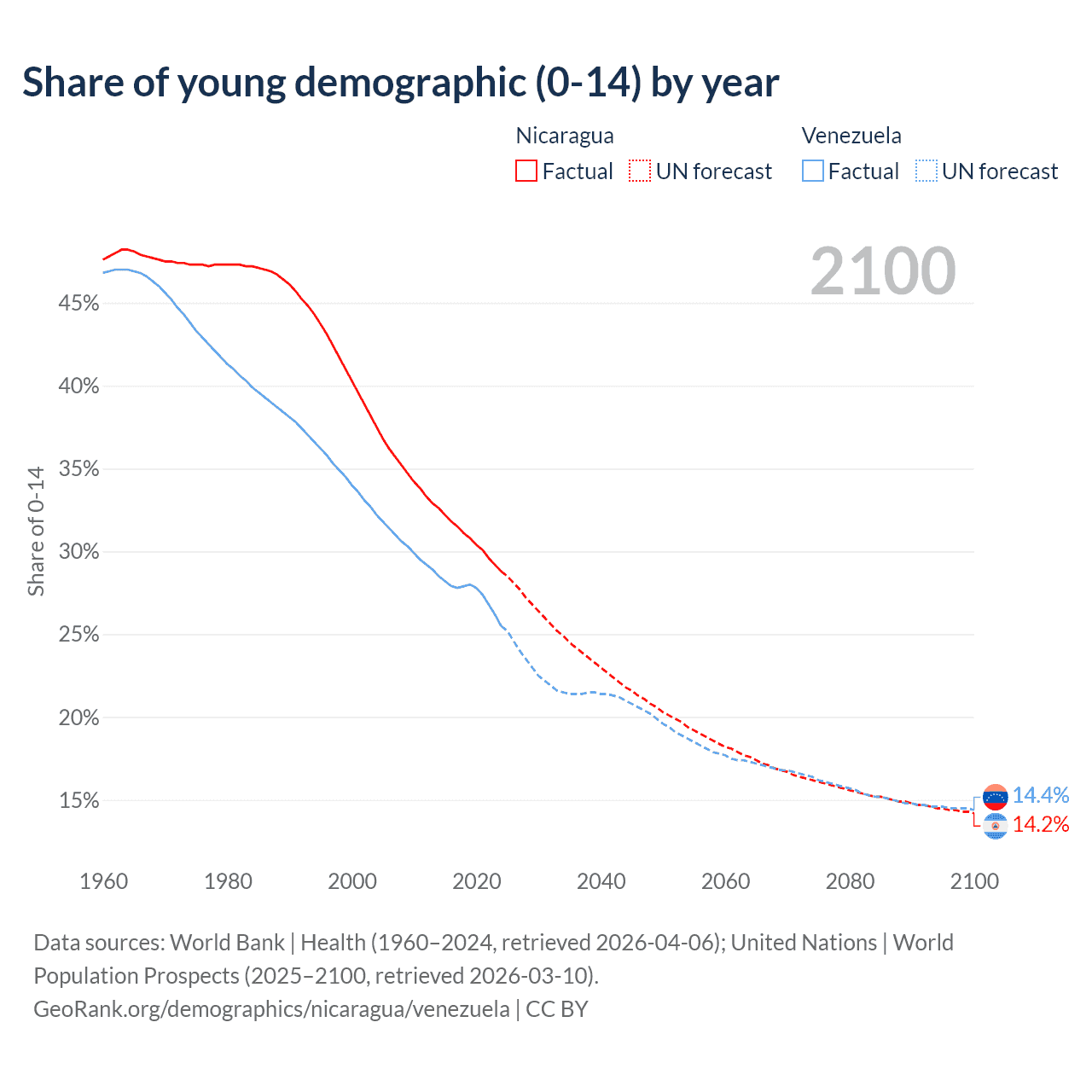 - The share of young demographic (0-15 years old) in Nicaragua is 28.8% vs 25.5% in Venezuela.