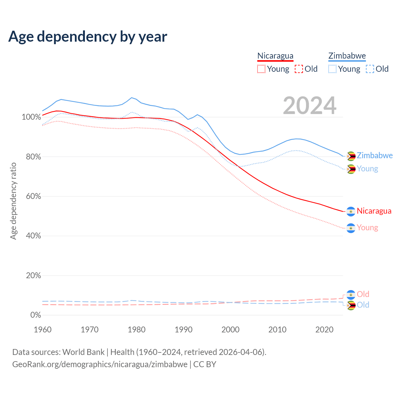 - Nicaragua is ranked 125/196 by median age (oldest to youngest) vs 177/196 for Zimbabwe.