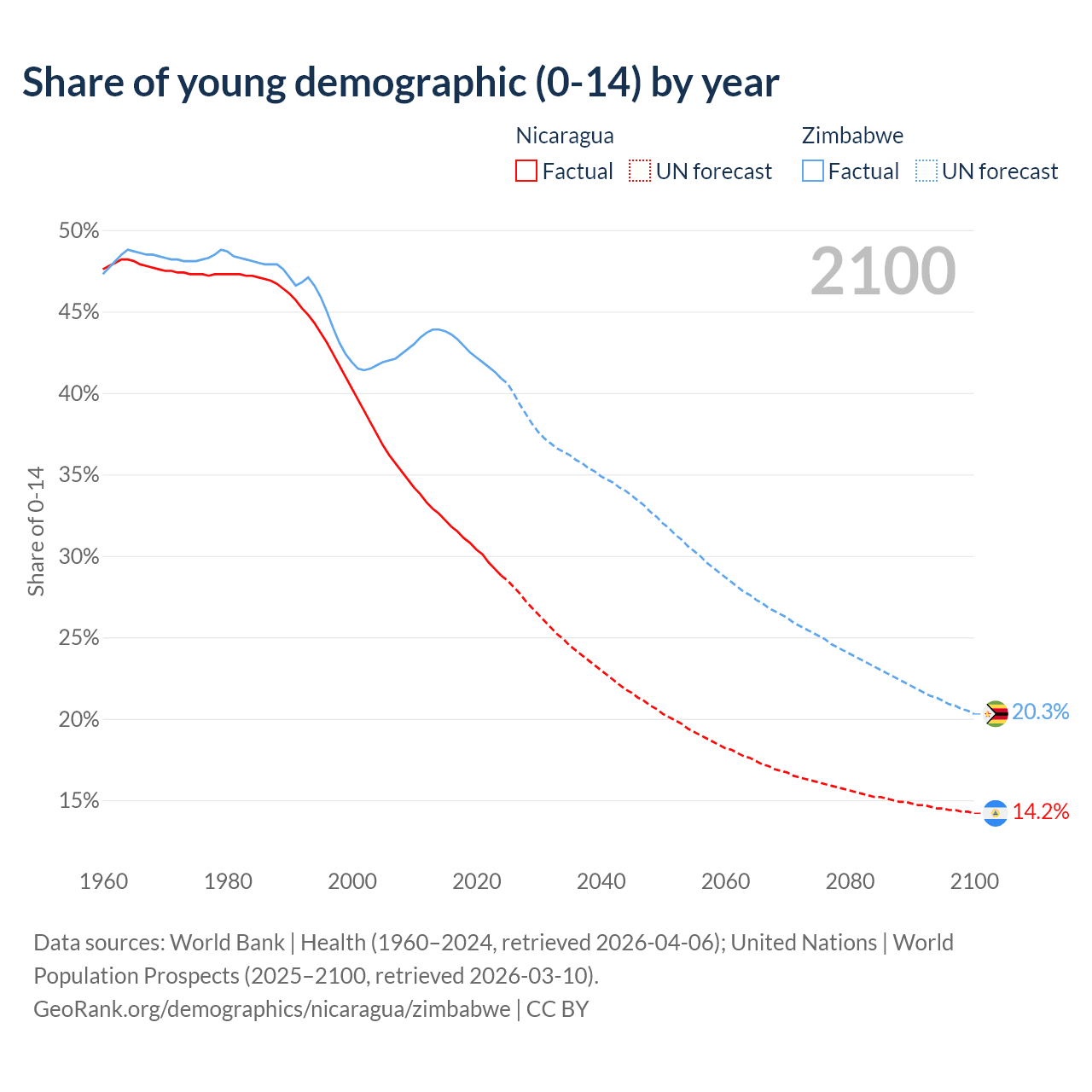 - The share of young demographic (0-15 years old) in Nicaragua is 28.8% vs 40.9% in Zimbabwe.