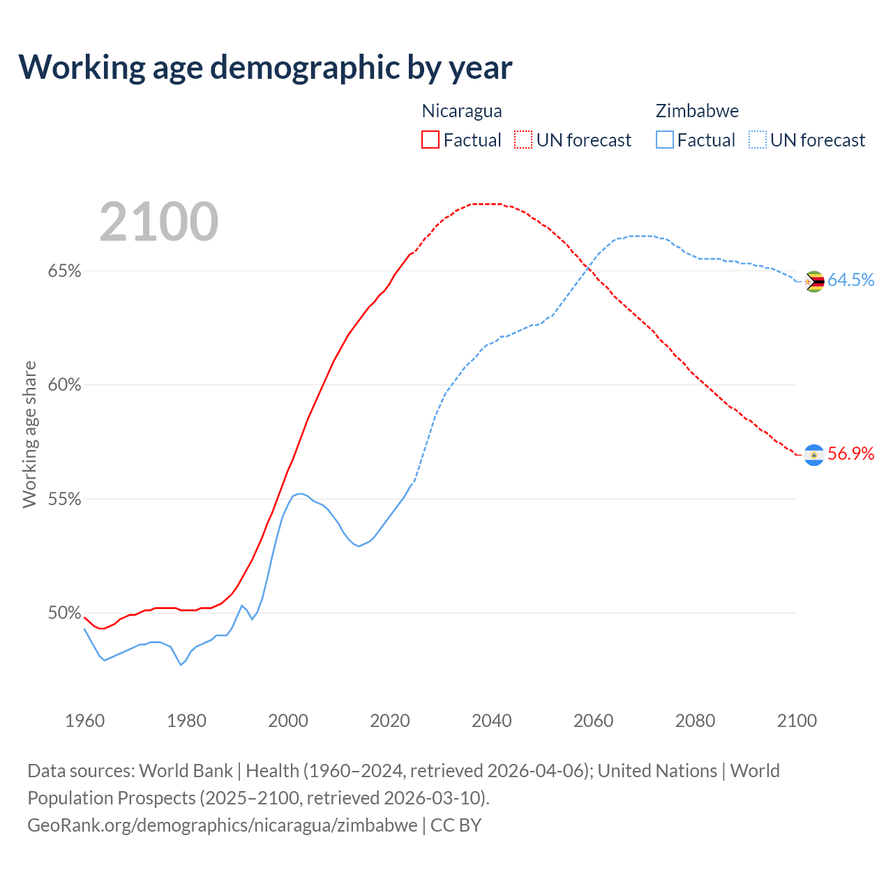 - The share of old-age demographic (65+) in Nicaragua is 5.53% vs 3.6% in Zimbabwe.