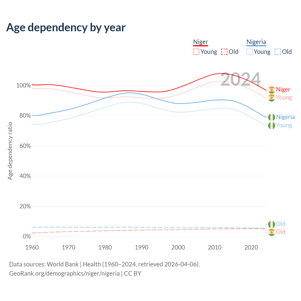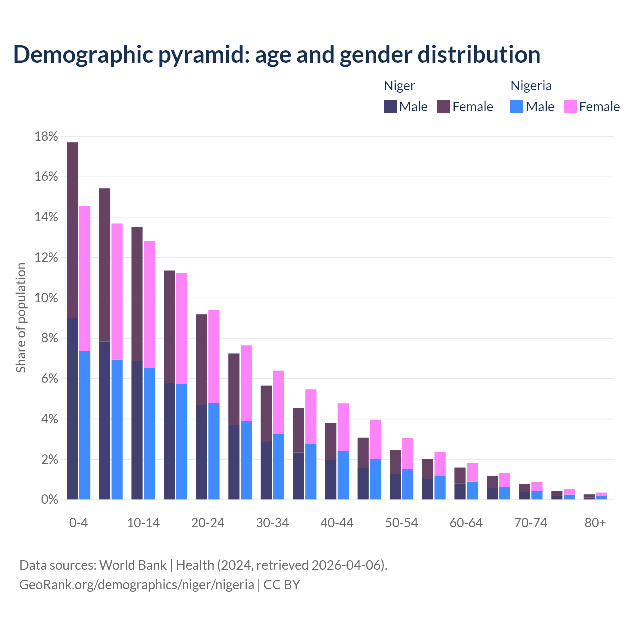 - Niger is ranked 195/196 by median age (oldest to youngest) vs 178/196 for Nigeria.