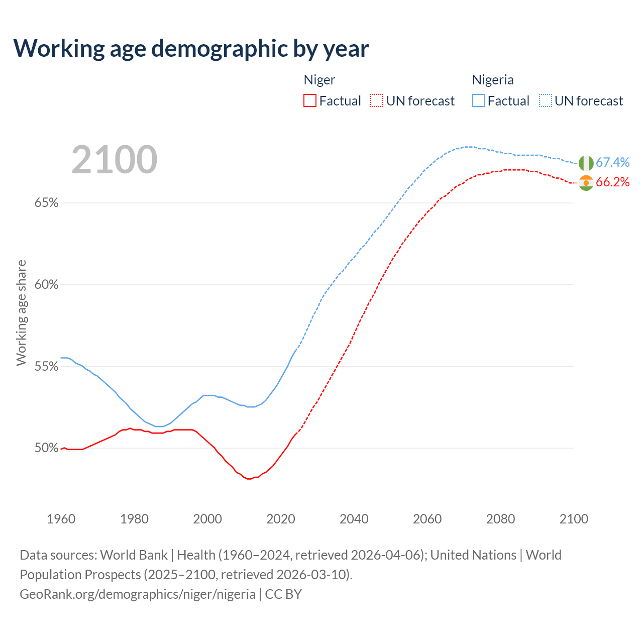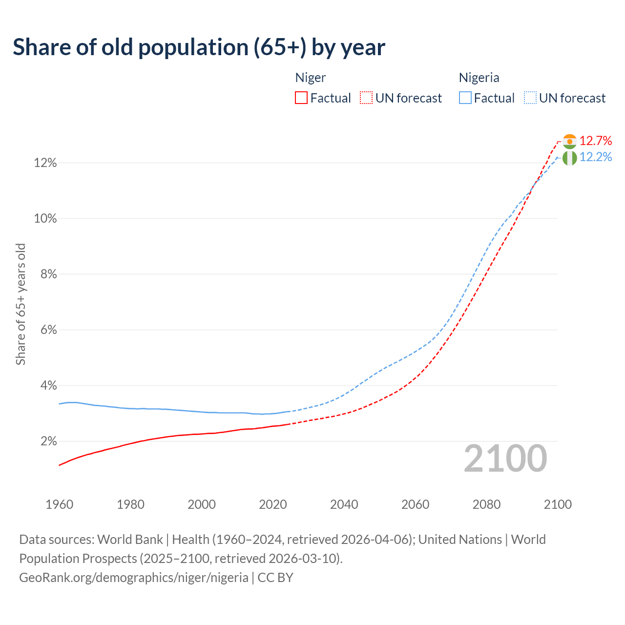The share of older people aged 65 and over is 2.59% in Niger and 3.05% in Nigeria. Life expectancy in Niger compared to Nigeria .