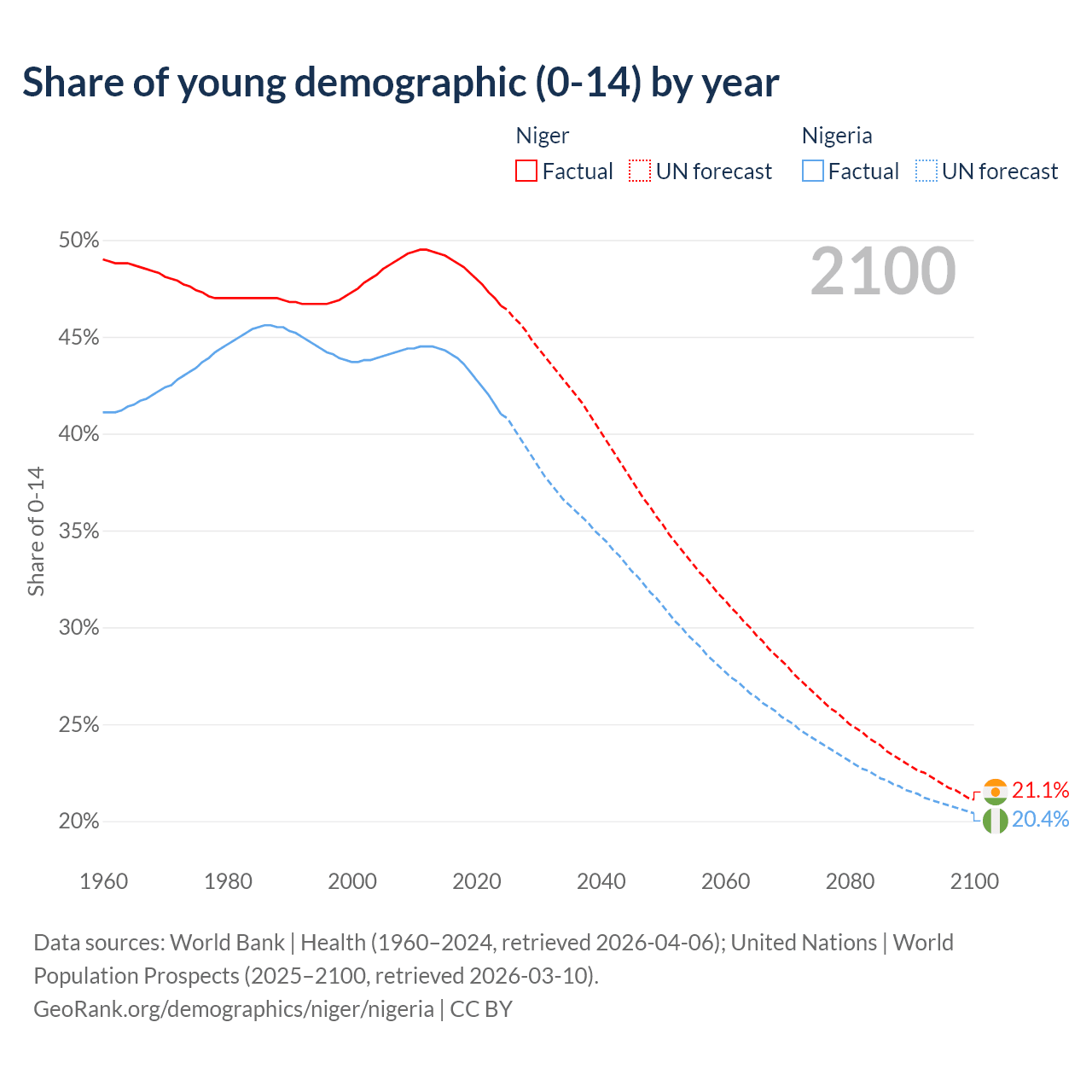 Median age Niger vs Nigeria, 1960-2100