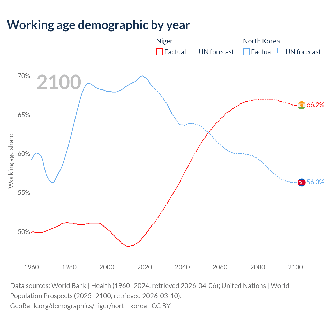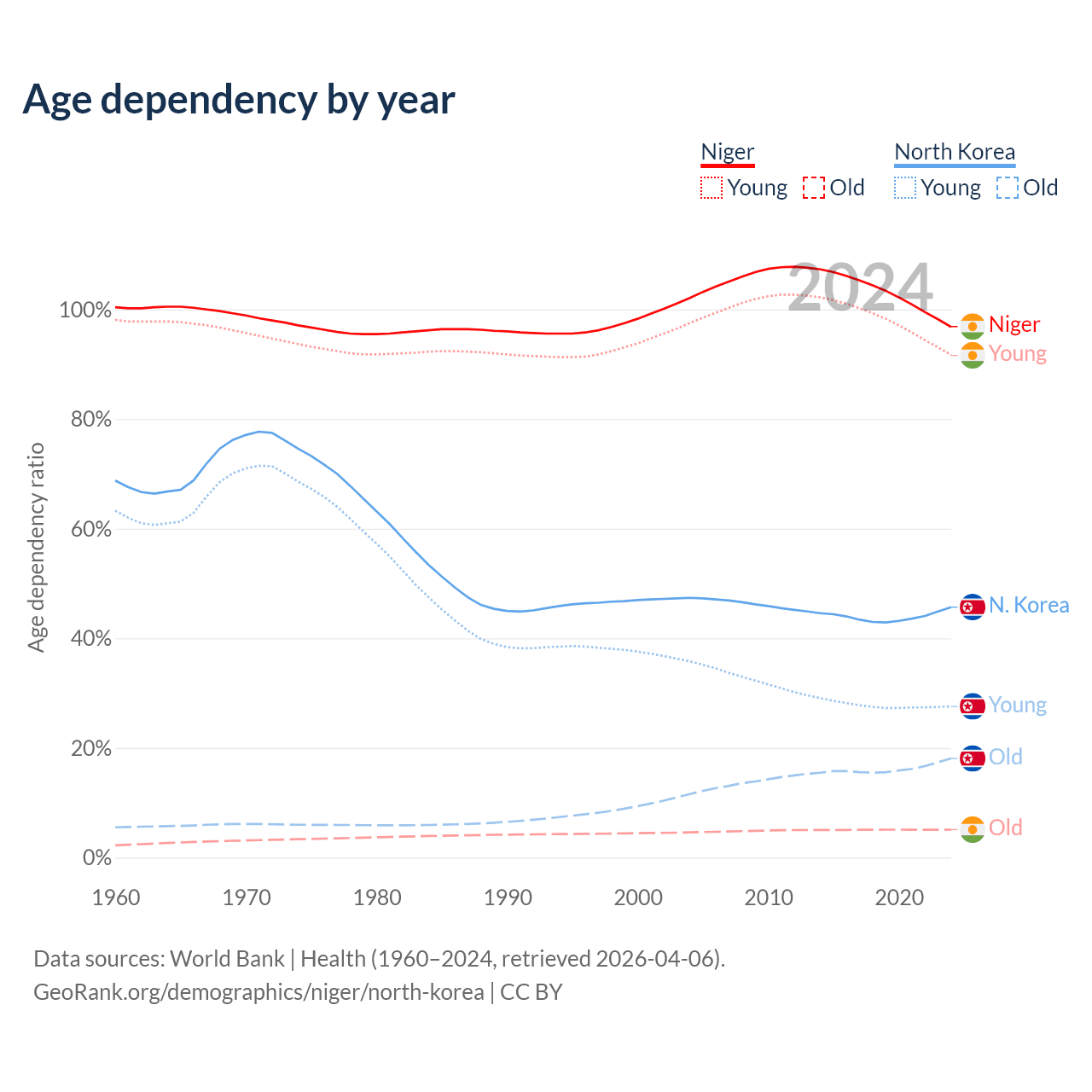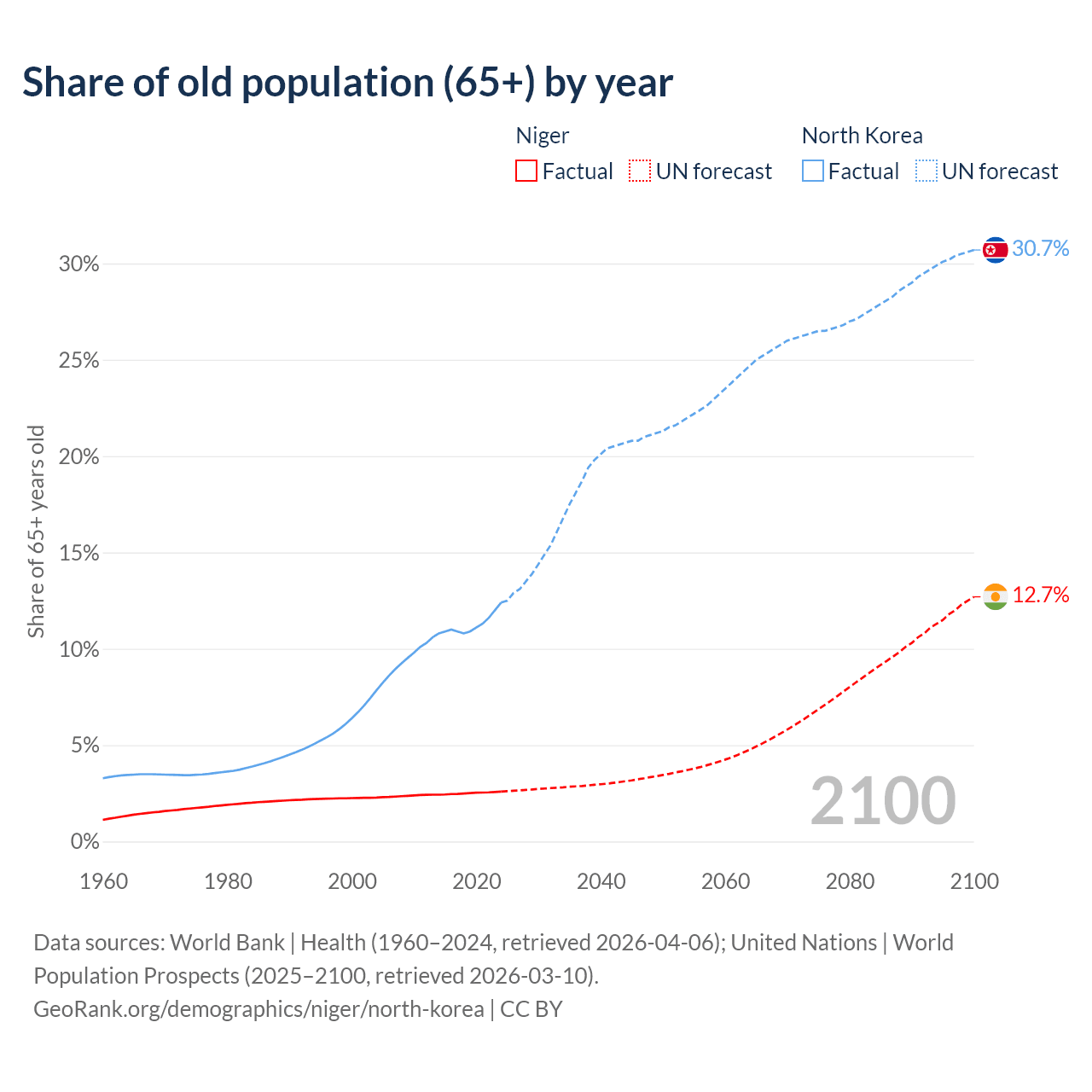 The share of older people aged 65 and over is 2.59% in Niger and 12.4% in North Korea. Life expectancy in Niger compared to North Korea .