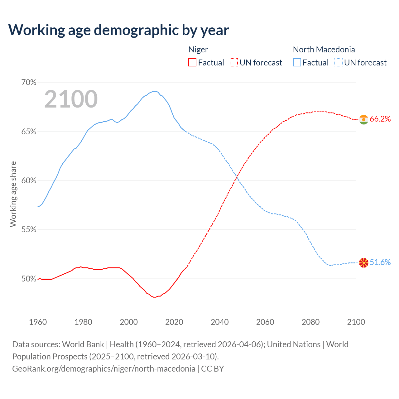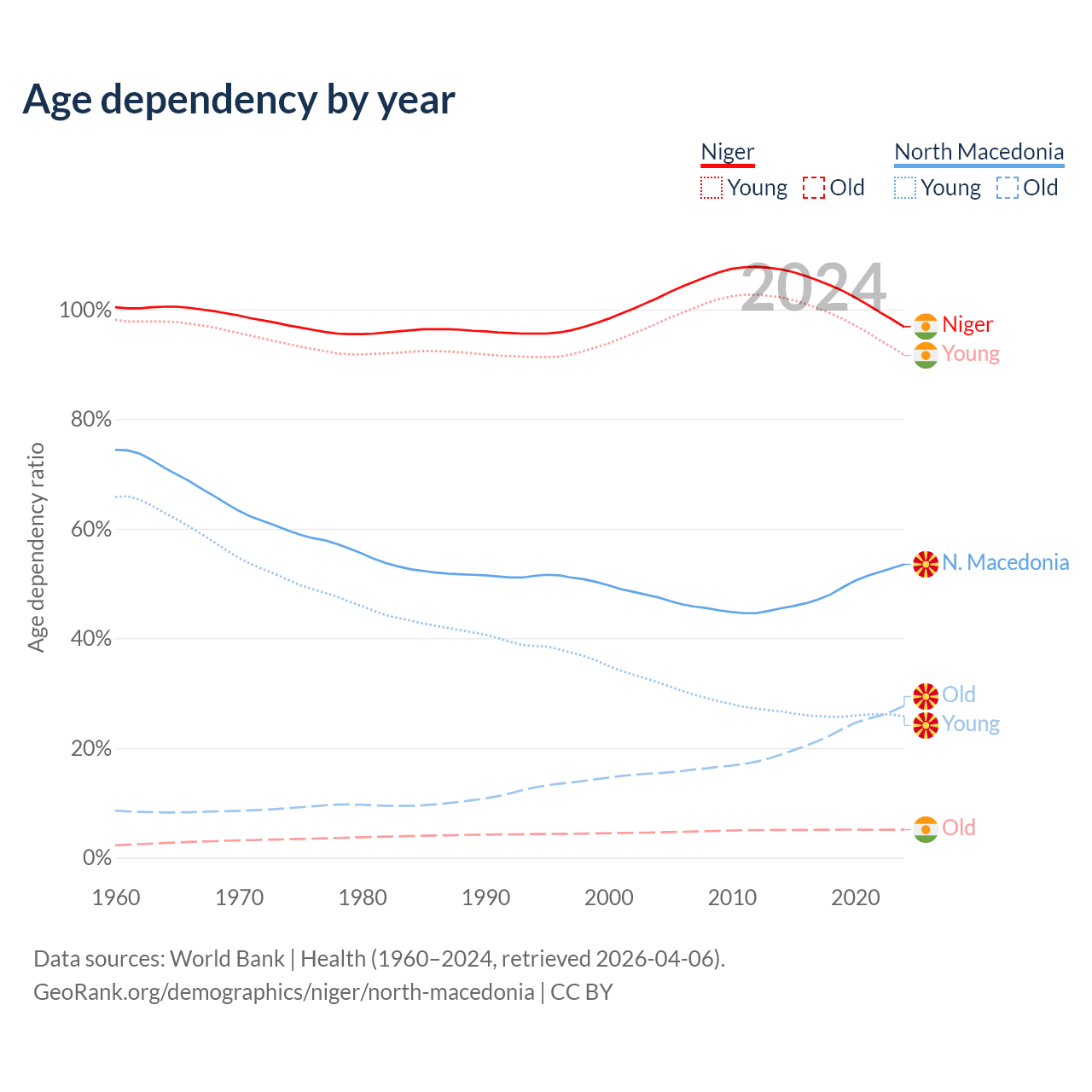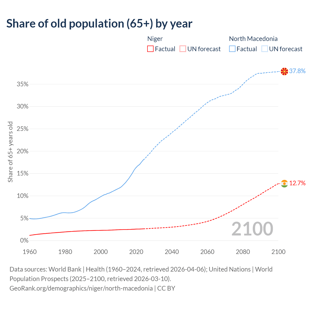 The share of older people aged 65 and over is 2.59% in Niger and 18% in North Macedonia. Life expectancy in Niger compared to North Macedonia .