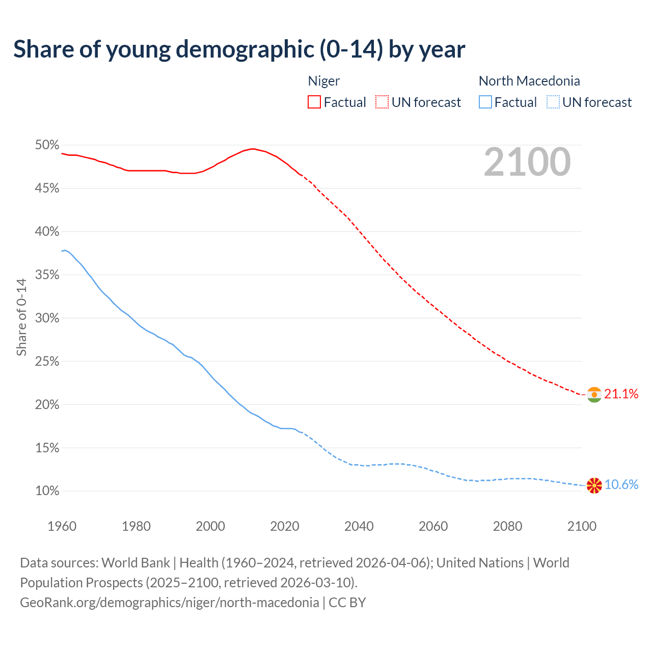 - The share of young demographic (0-15 years old) in Niger is 46.6% vs 16.8% in North Macedonia.