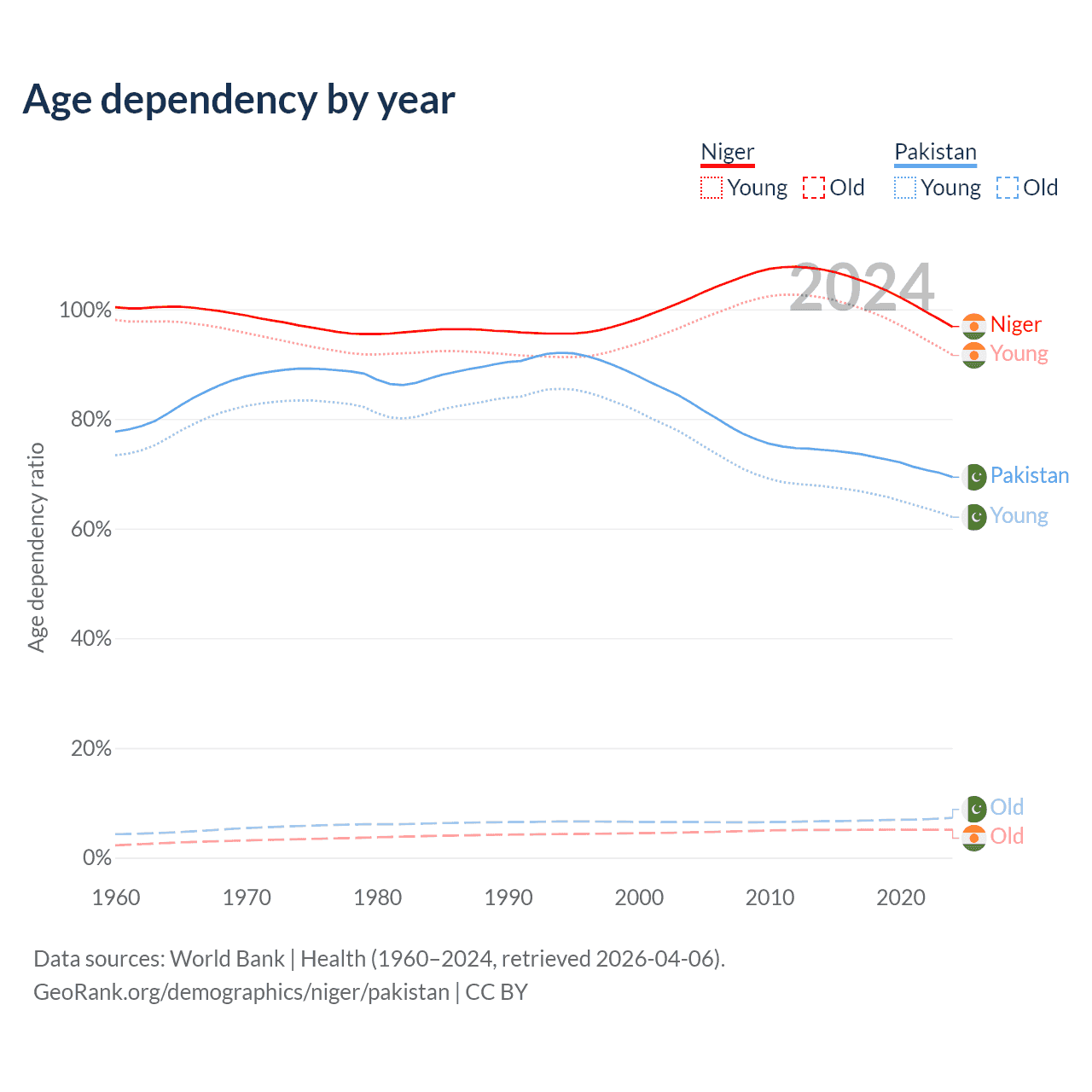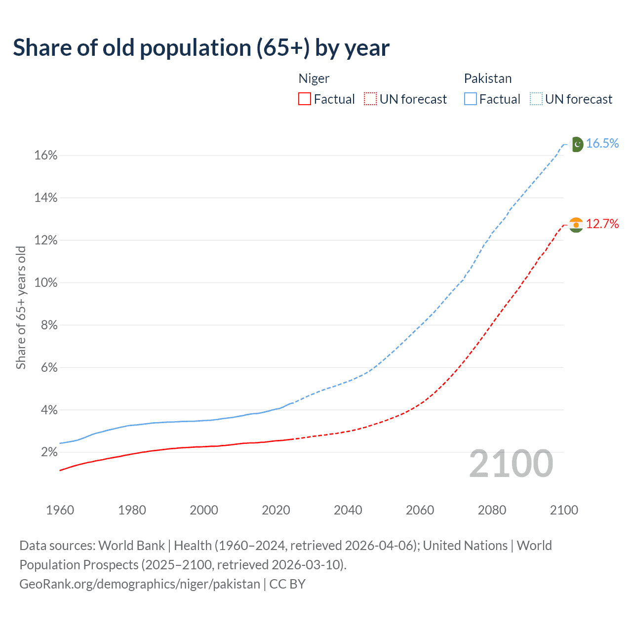 - The share of old-age demographic (65+) in Niger is 2.59% vs 4.28% in Pakistan.