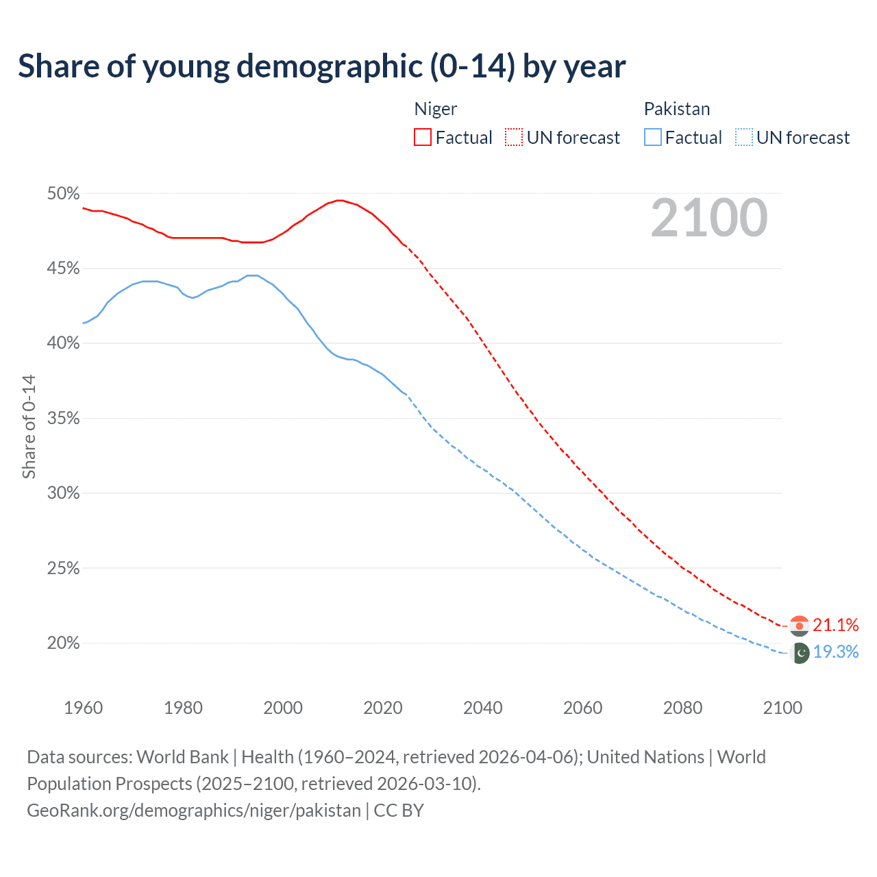 - The share of young demographic (0-15 years old) in Niger is 46.6% vs 36.7% in Pakistan.