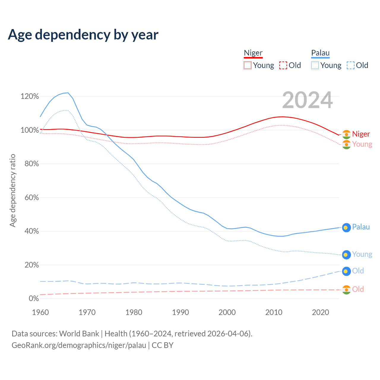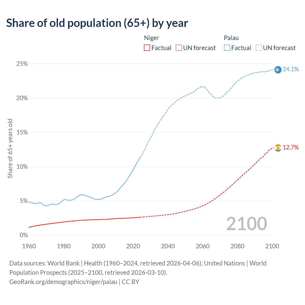 - The share of old-age demographic (65+) in Niger is 2.59% vs 11.3% in Palau.
