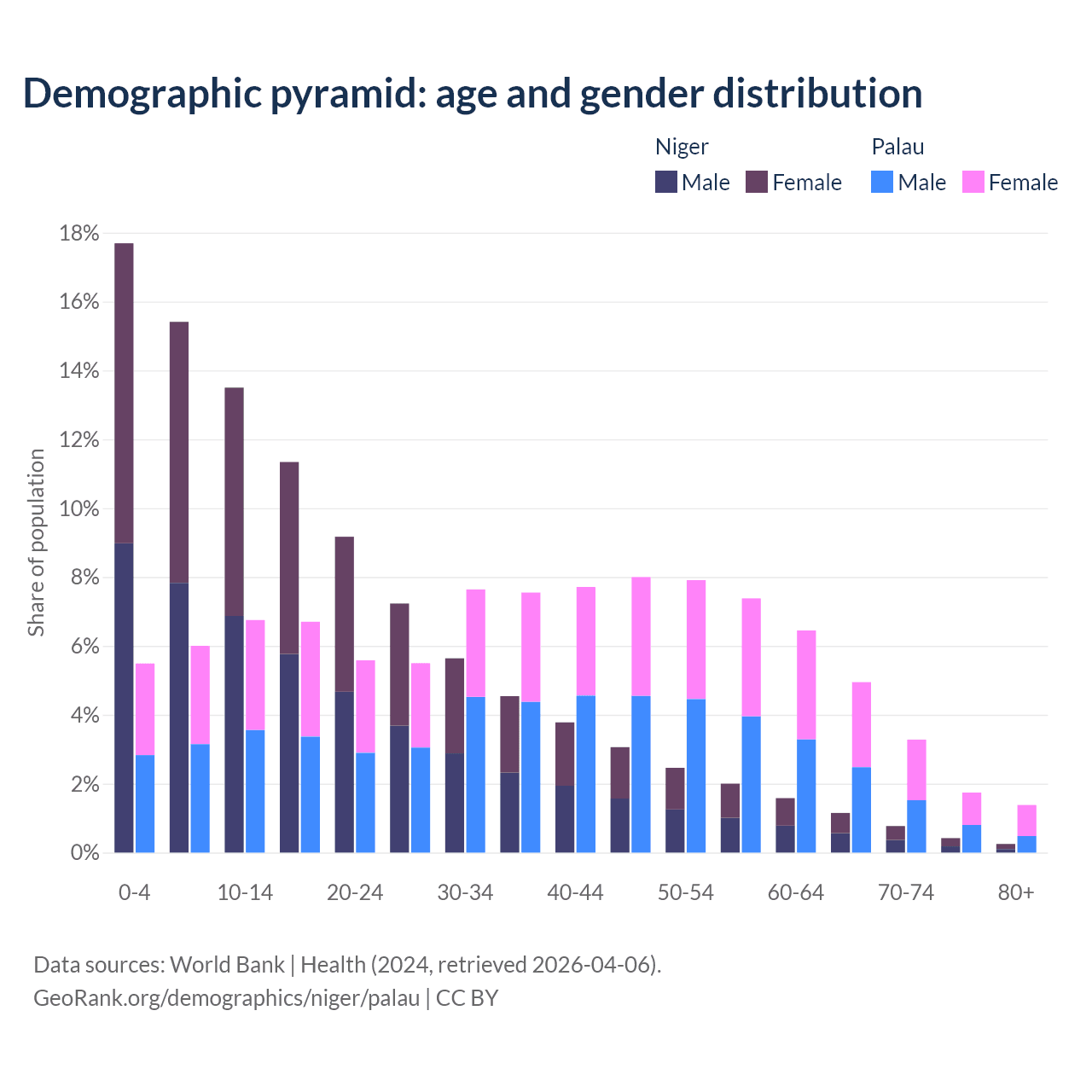 - As of 2026, the population of Niger is 29.1M vs 17.6K in Palau - 1,650 times difference.