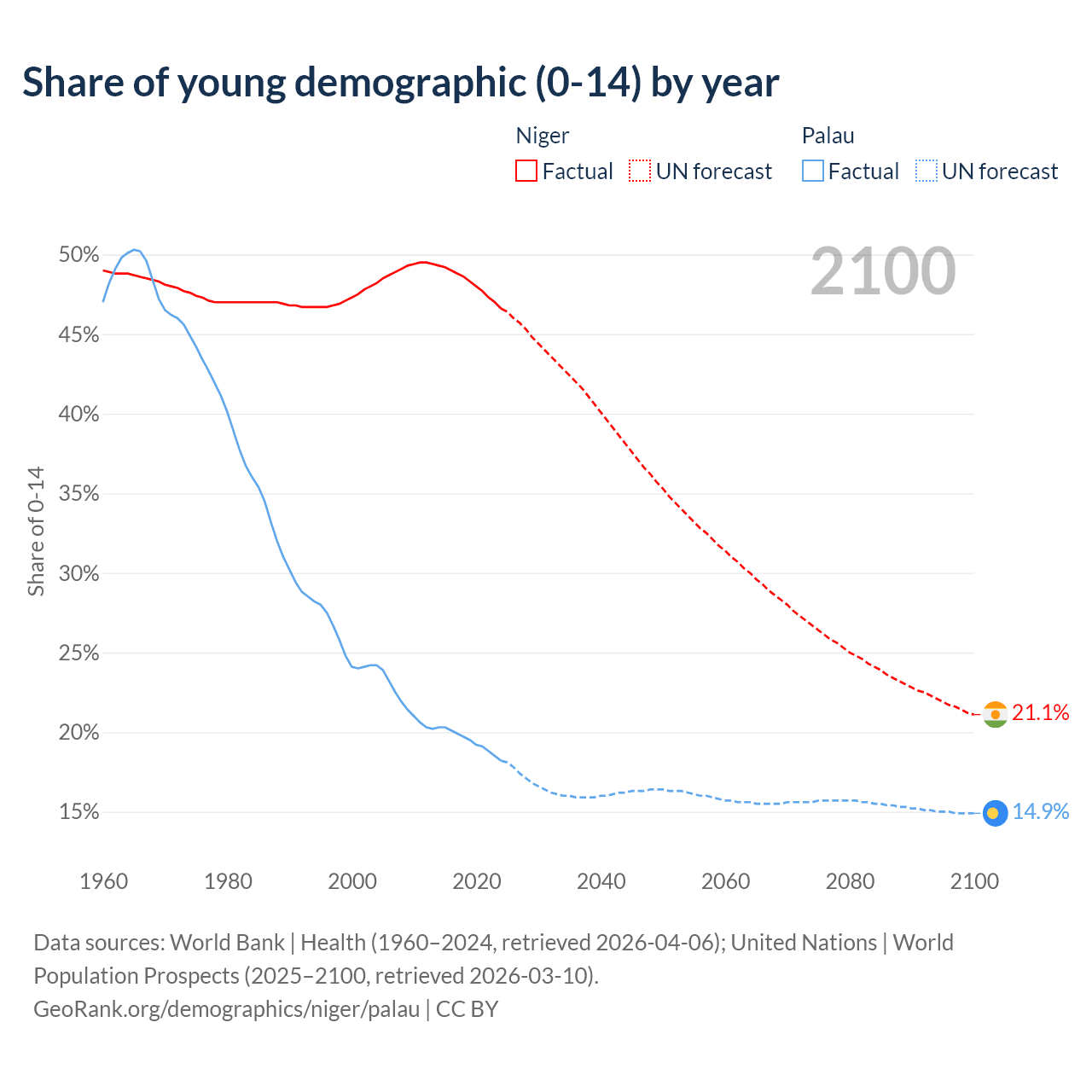 - The share of young demographic (0-15 years old) in Niger is 46.6% vs 18.2% in Palau.