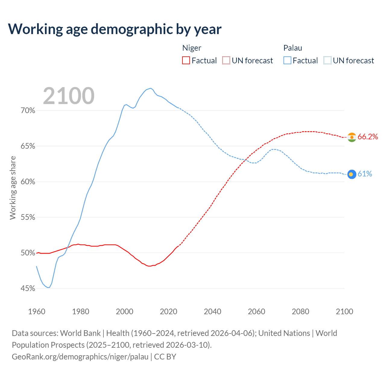 - Niger has 14.8M working age adults (aged 15-64) vs 12.4K in Palau.