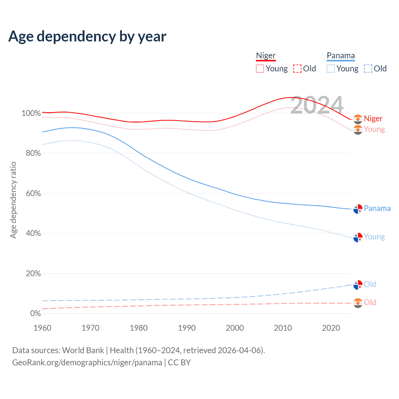 - The share of old-age demographic (65+) in Niger is 2.59% vs 9.35% in Panama.